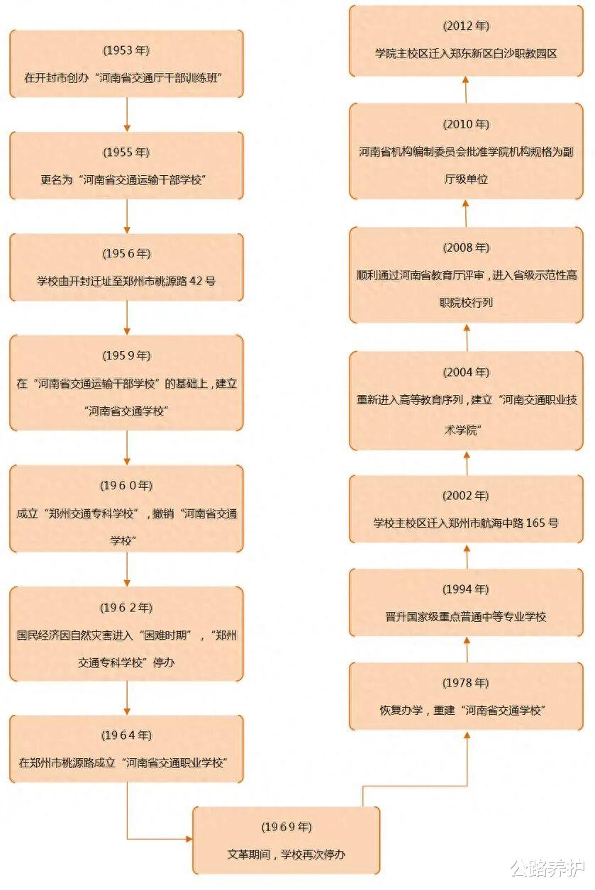 二、历史沿革河南交通职业技术学院创建于1953年,始名河南省交通厅干部训练班,经河南交通运输学校、河南省交通学校、郑州交通专科学校、河南省交通职业学校诸阶段,期间历经两次停办,1979年恢复建校。2004年经河南省人民政府批准,教育部备案,升为河南交通职业技术学院。