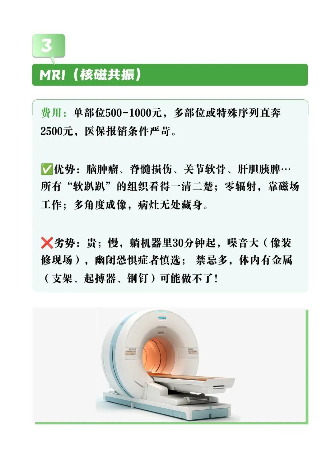 ❌劣势:贵;慢,躺机器里30分钟起,噪音大(像装修现场),幽闭恐惧症者慎选; 禁忌多,体内有金属(支架、起搏器、钢钉)可能做不了!