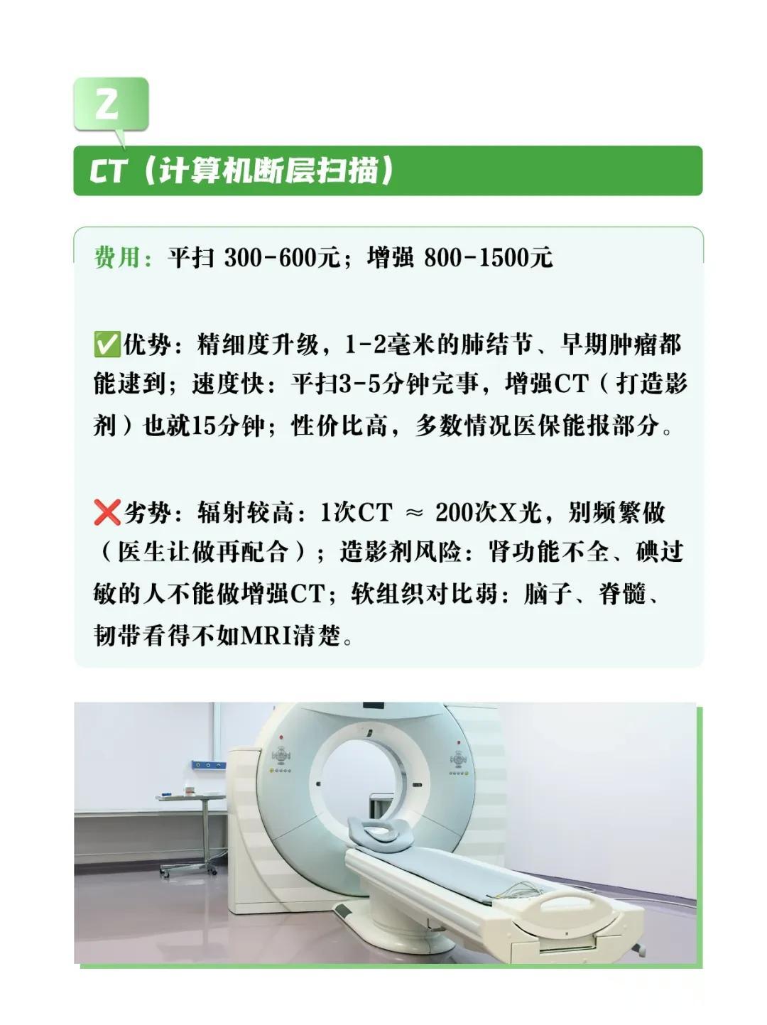 ✅优势:相对便宜,医保基本能报;出结果速度快,从检查到出报告,30分钟搞定;辐射低,相当于坐2小时飞机。