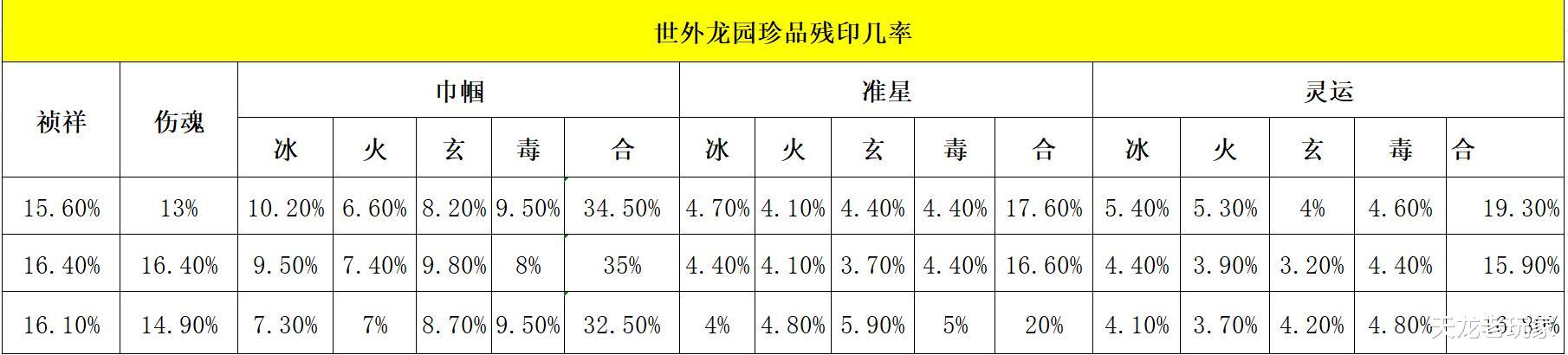 祯祥和伤魂开出来的几率最大,单种基本能达到15%-17%;巾帼(冰火玄毒)总几率能达到32%-35%,其中火是最难开的,其他三种几率差不多。