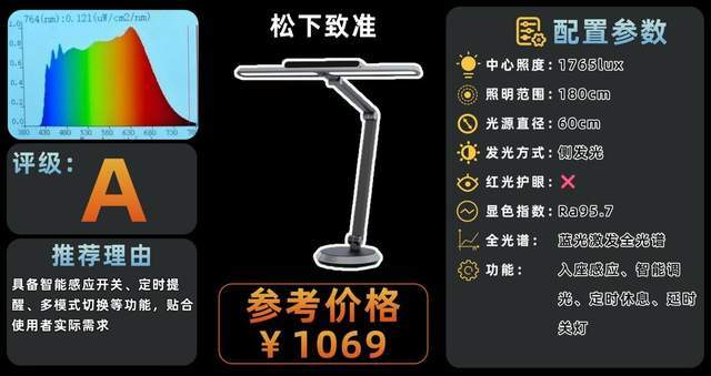 哪个品牌的护眼灯最好?松下致准在光源上采用升级版低蓝光全光谱方案,蓝光含量较低,整体光线柔和,对眼睛压力小。灯头操作比较集中,带显示屏,调节亮度和模式直观方便,同时支持环境光自动调节亮度的功能,不用总动手调节。入座即亮功能也增加了使用便利性。不过用久了按键会有点迟钝,需要重复操作才生效,书写时偶尔会出现重影现象。