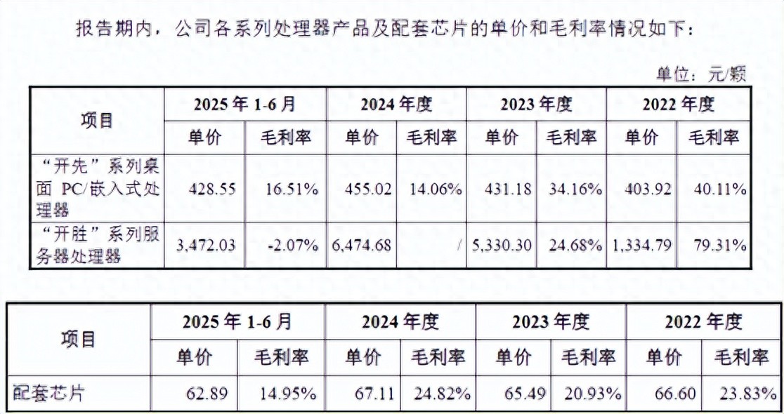 “开胜”系列处理器于2023 年上市销售,首款产品是面向存储、边缘计算以及虚拟化等服务器市场的KH-40000 服务器处理器,2023 年实现收入 18,265.15 万元。2024 年末,公司与主要经销商针对 KH-40000 服务器处理器的销售模式变更为非买断式经销并冲减 2024年收入,导致 2024 年“开胜”系列服务器处理器收入为负。公司“开胜”系列其他处理器系部分面向特定市场的产品,产生少量收入。公司“开胜”系列处理器 2023 年和 2024 年平均单价显著提升,主要原因系该期间内公司主要销售 KH-40000 服务器处理器,销售价格较高。2024 年末,公司针对 KH-40000 服务器处理器定价进行调整以进一步打开市场,抢占市场份额,导致后续价格和毛利率有所下降。