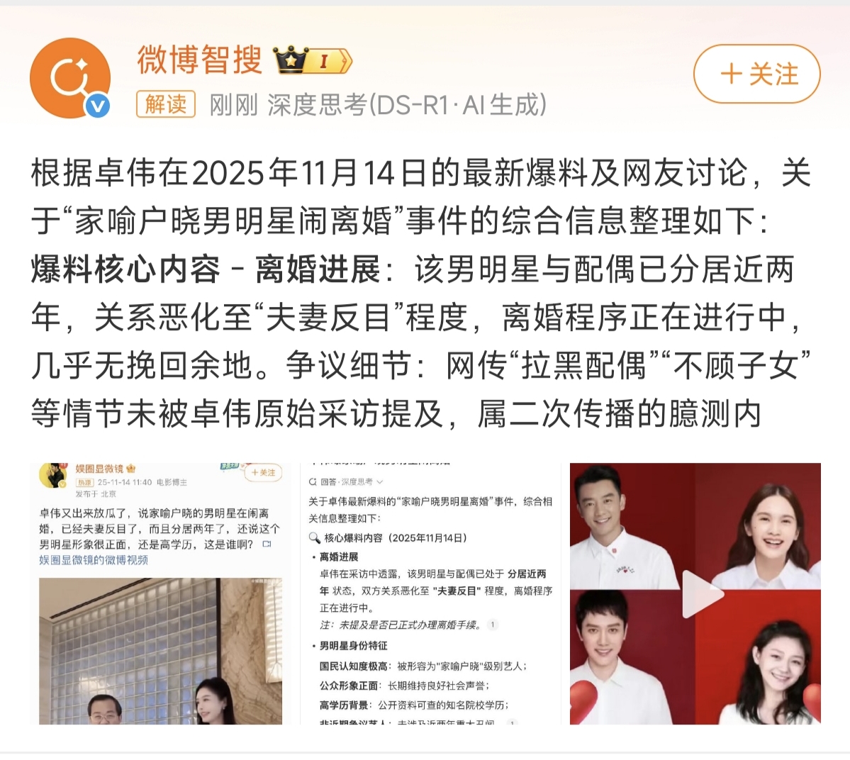 家人们谁懂啊!娱乐圈“纪检委”卓伟又双叒叕搞事情啦!最近,卓伟在某饭局上酒过三巡,直接开启“大喇叭”模式,爆料某家喻户晓的男明星正在闹离婚,而且夫妻俩已经分居,反目成仇,这消息一出来,瞬间在网上炸开了锅,网友们纷纷化身“吃瓜群众”,开启疯狂猜测模式。