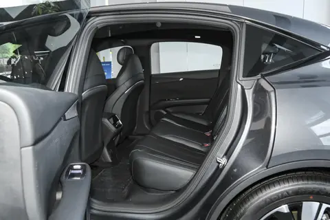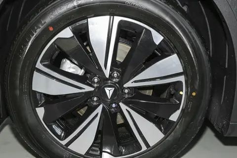 车身侧面是最让人惊艳的部分,其溜背式车顶从 B 柱开始缓缓下滑,线条流畅得没有一丝突兀,既避开了传统溜背车的 “压抑感”,又勾勒出类似轿跑的灵动姿态;而无框车门的设计,在 15 万级车型里堪称 “越级配置”,取消了厚重的门框后,侧面视觉更通透,开门时也多了几分精致感,哪怕是日常接送孩子,也能收获不少路人的目光。另外,其轮毂采用 19 英寸星芒式设计,银色轮毂搭配黑色卡钳,运动氛围直接拉满,试驾时不管是低速城区行驶,还是高速飞驰,轮毂转动起来都像流动的光影,细节处很显质感。