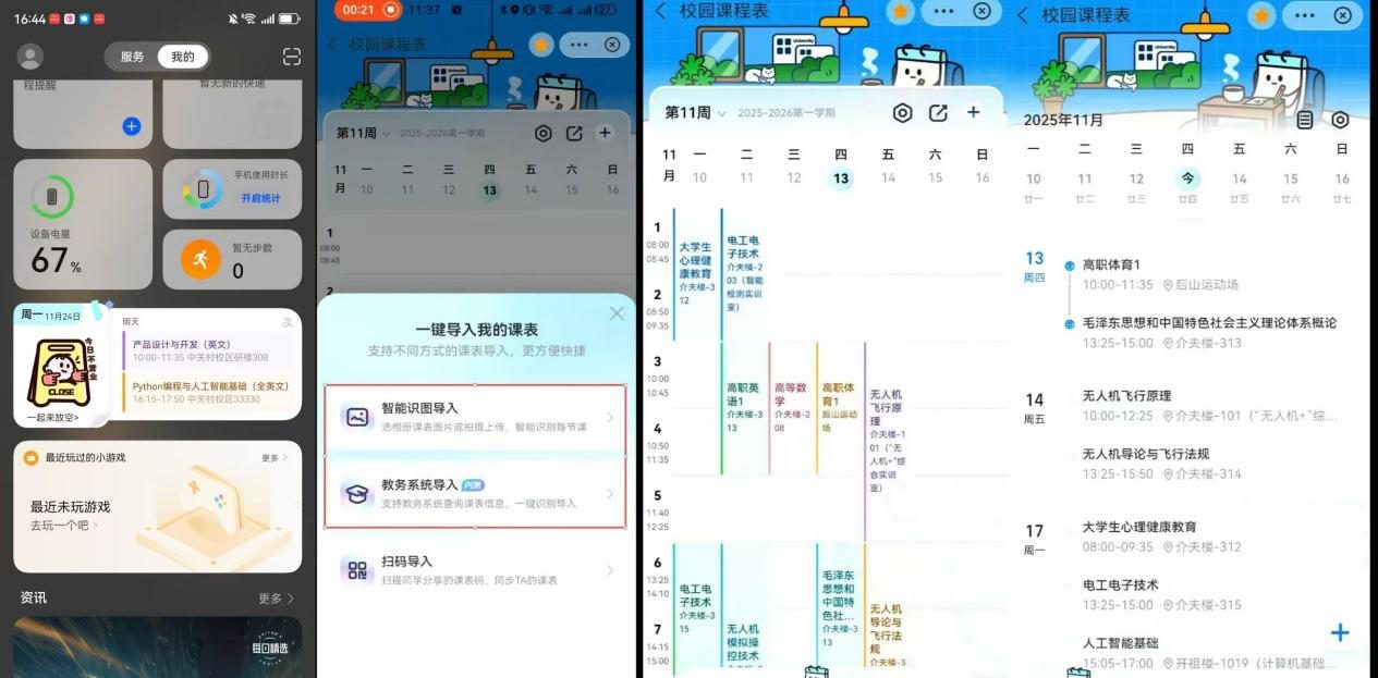 添加成功后,课程表将常驻负一屏,支持智能识图和从真实教务系统导入课程信息,学生无需打开支付宝App即可快速查看课程时间、上课地点等关键信息,学习生活更加从容。