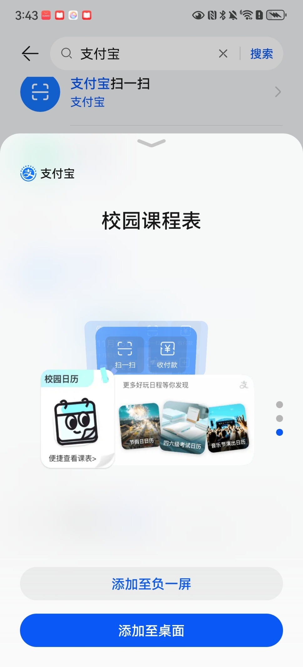 在华为负一屏顶部搜索框中输入“支付宝”“学生课表”或“学生课表添加”等关键词,直接定位并添加课程卡片;