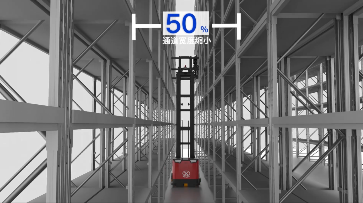 依托中力独家专利的双侧智能叉取技术,该机器人无需转向掉头,左右叉臂可直接完成货物取放,车身宽度即通道宽度,将最窄作业通道压缩至仅 1740mm。这一设计让同等仓储面积下的货架布局增加近一倍,直接节省仓储面积约50%,实现“窄巷革命”。