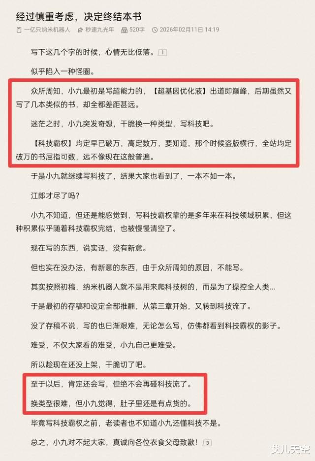 这次切书后,他说后面不打算再碰科技流的题材了,准备换其他类型。等到后面有新书的时候我们再来看看。