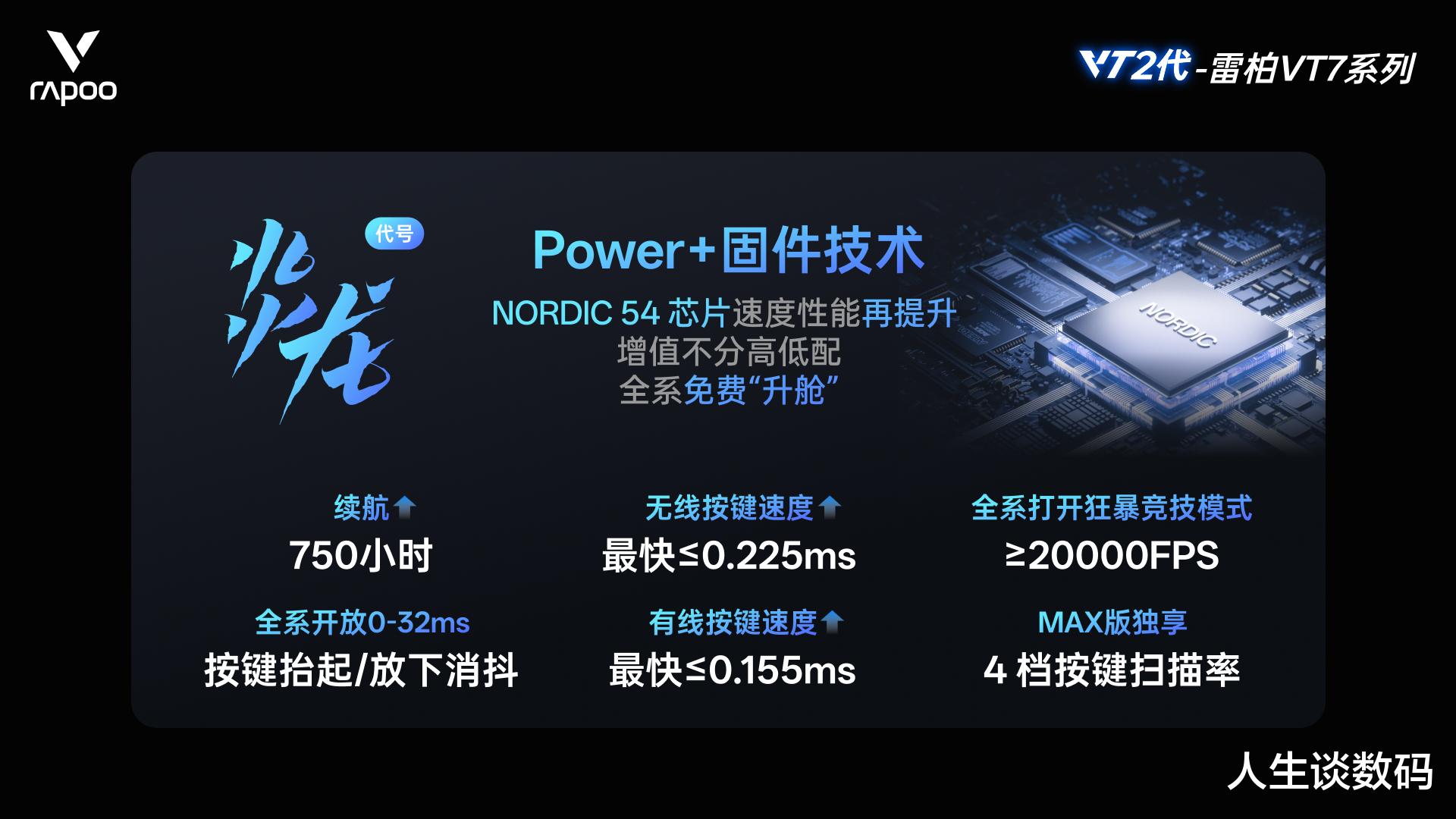 连接性能上,雷柏VT7系列支持有线和无线两种连接模式。在2.4GHz无线连接模式下,能实现8000Hz回报率,并且雷柏还未VT7系列推出了Power+(代号:炎龙)的固件技术,不分高低配,标准版、MAX版均可通过OTA增值。
