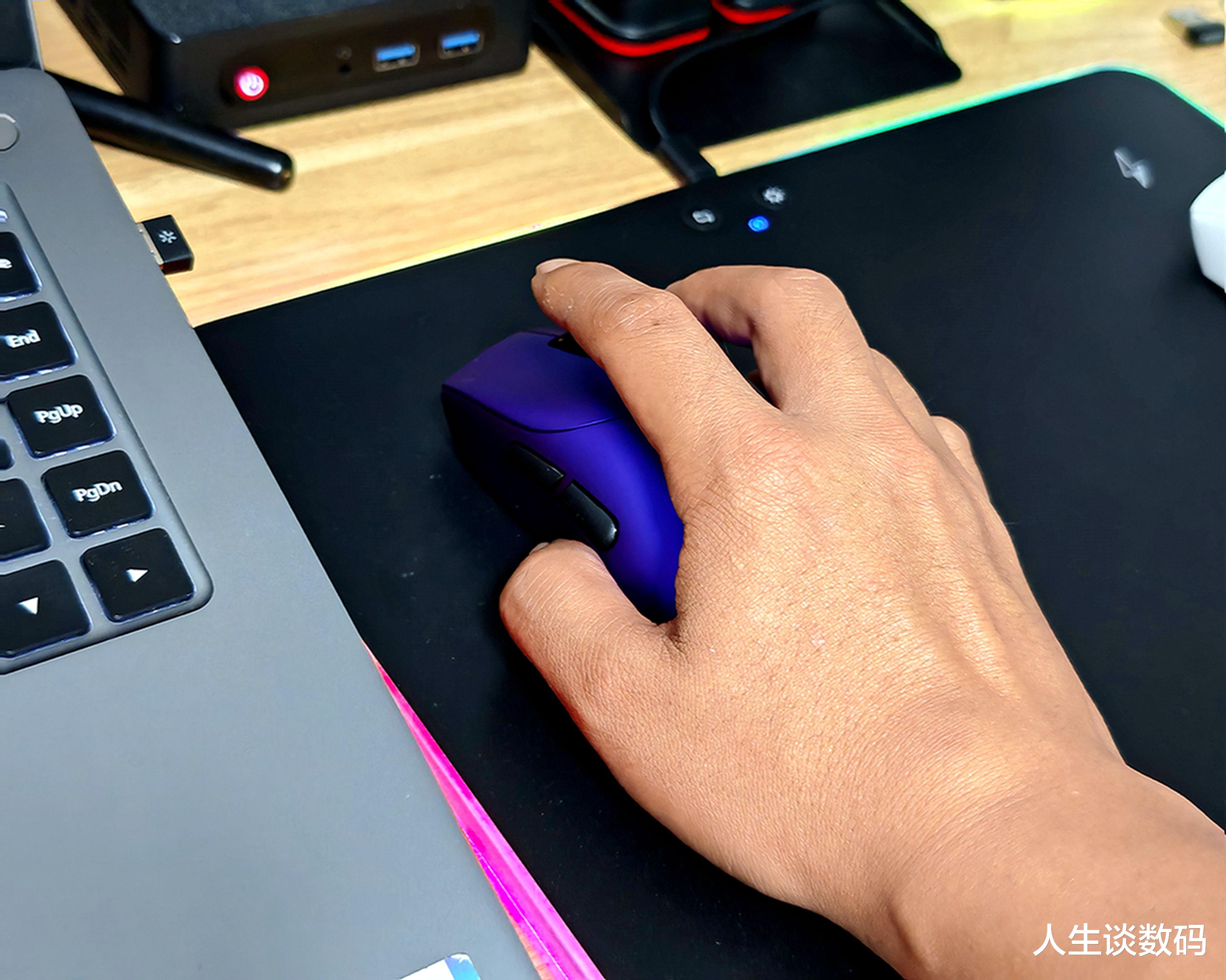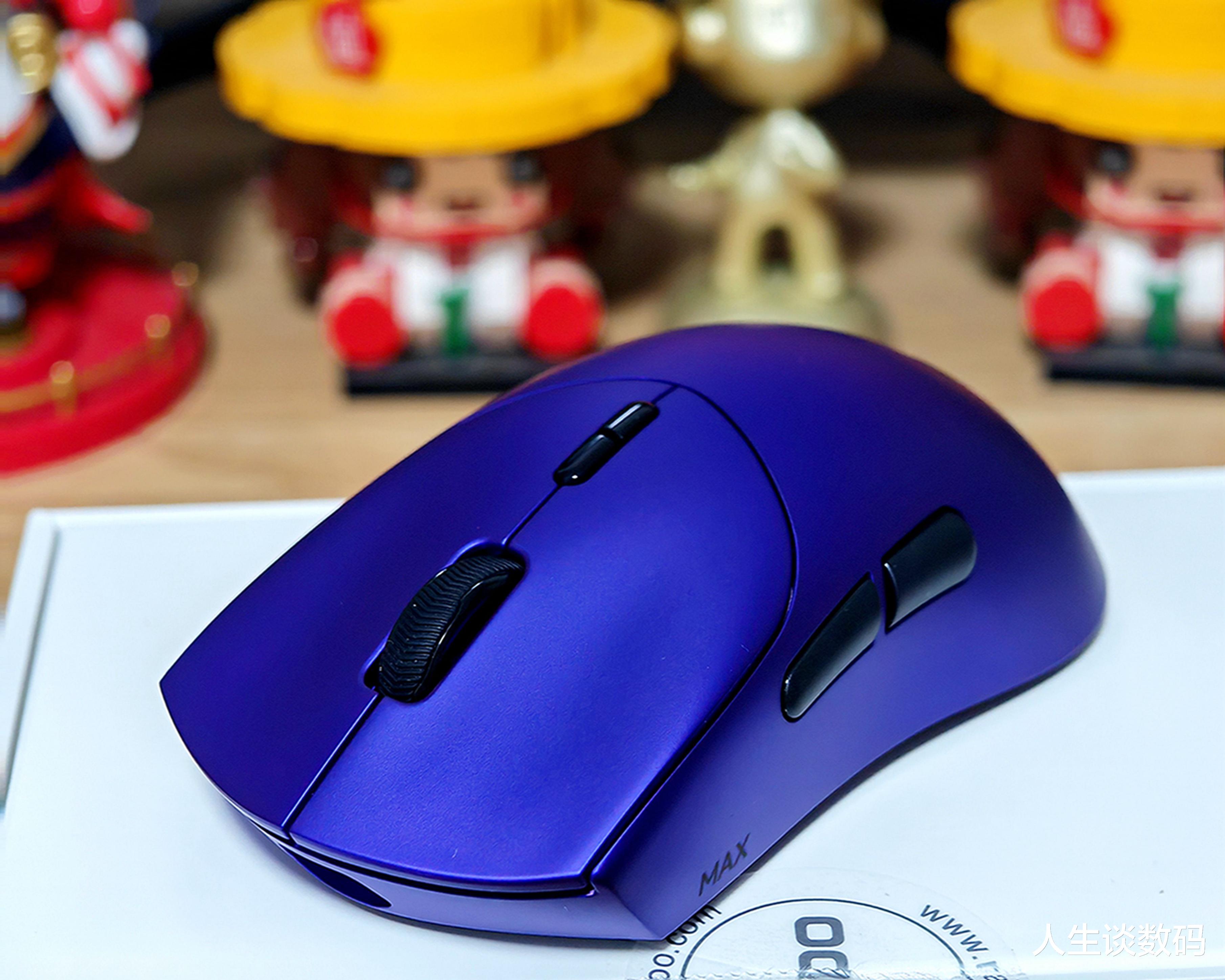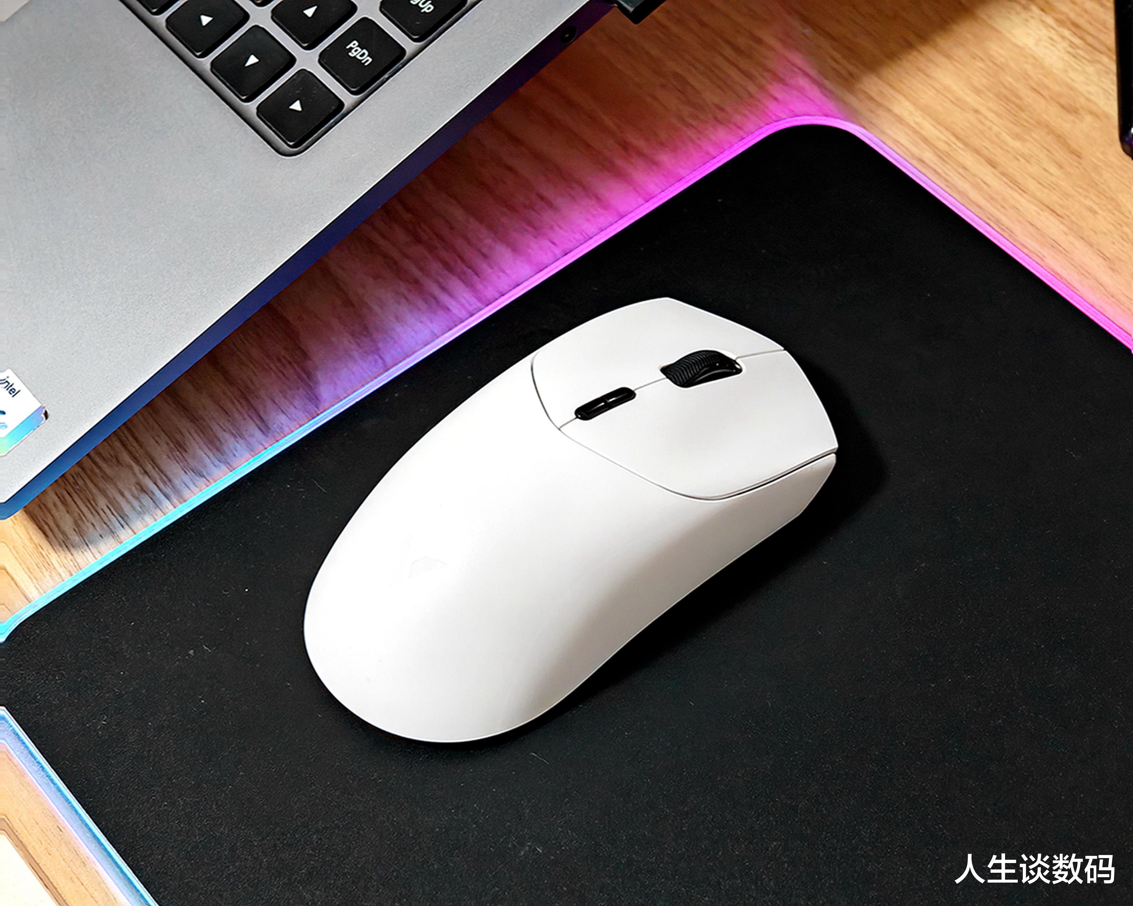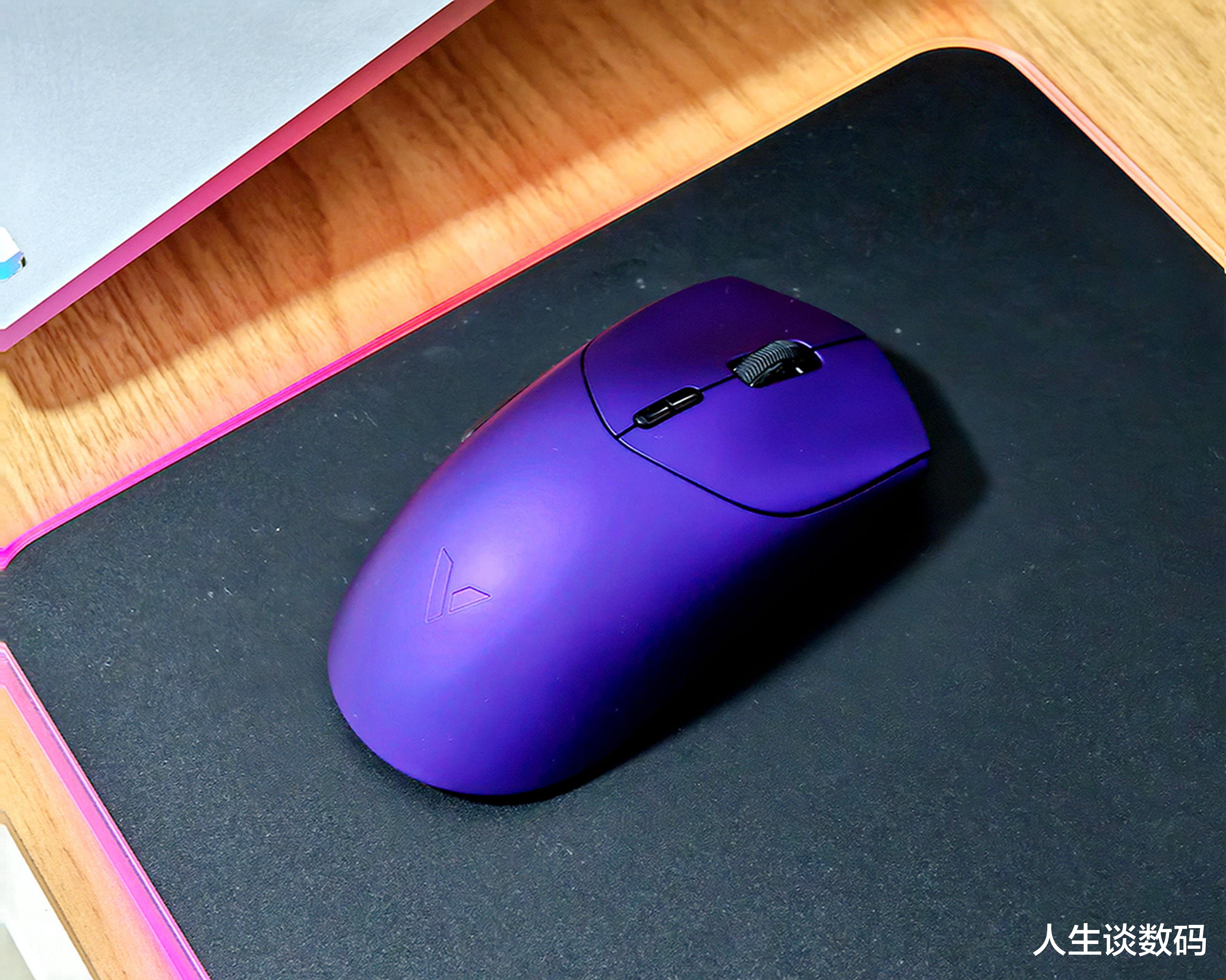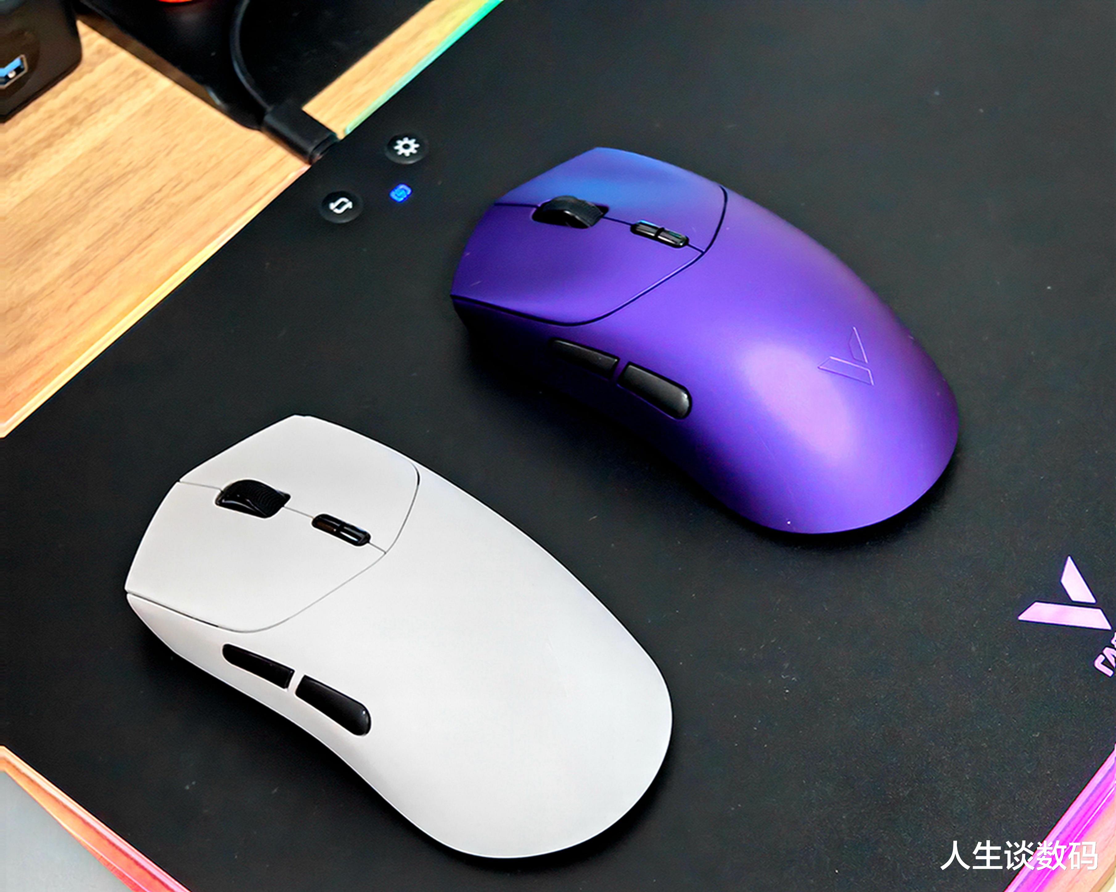两款鼠标的按键布局相同,前侧左右按键为分离式设计,使手感更平衡;左侧有两个前进键,顶部除滚轮和中间两个自定义键外,还有隐藏式小指示灯,充电或切换DPI时才显示。底部有防滑贴、开关推钮及紫色自定义DIY独立键,磁吸盖板吸力足且方便拆卸。