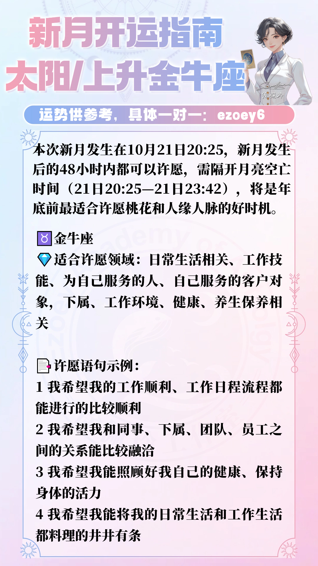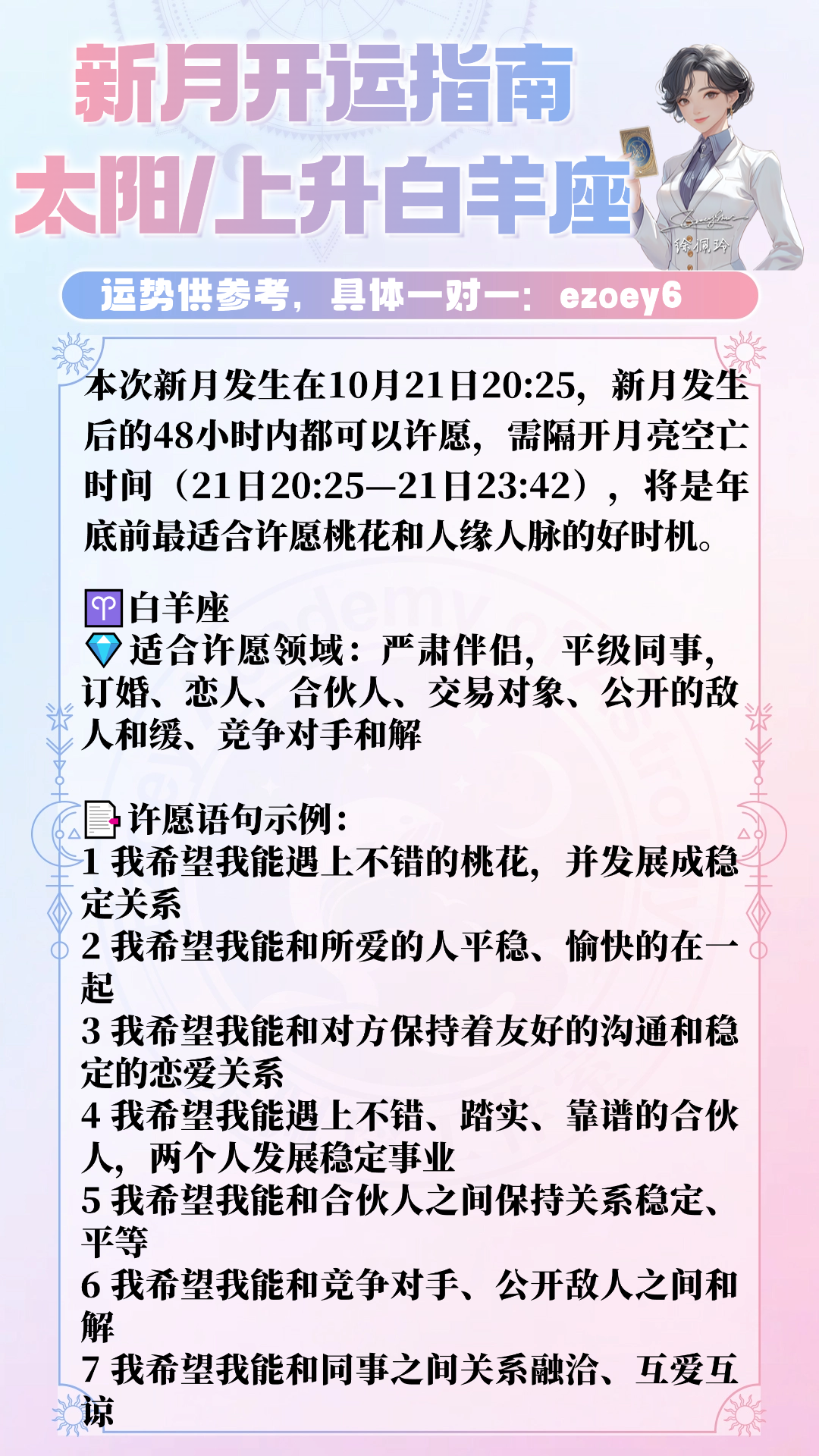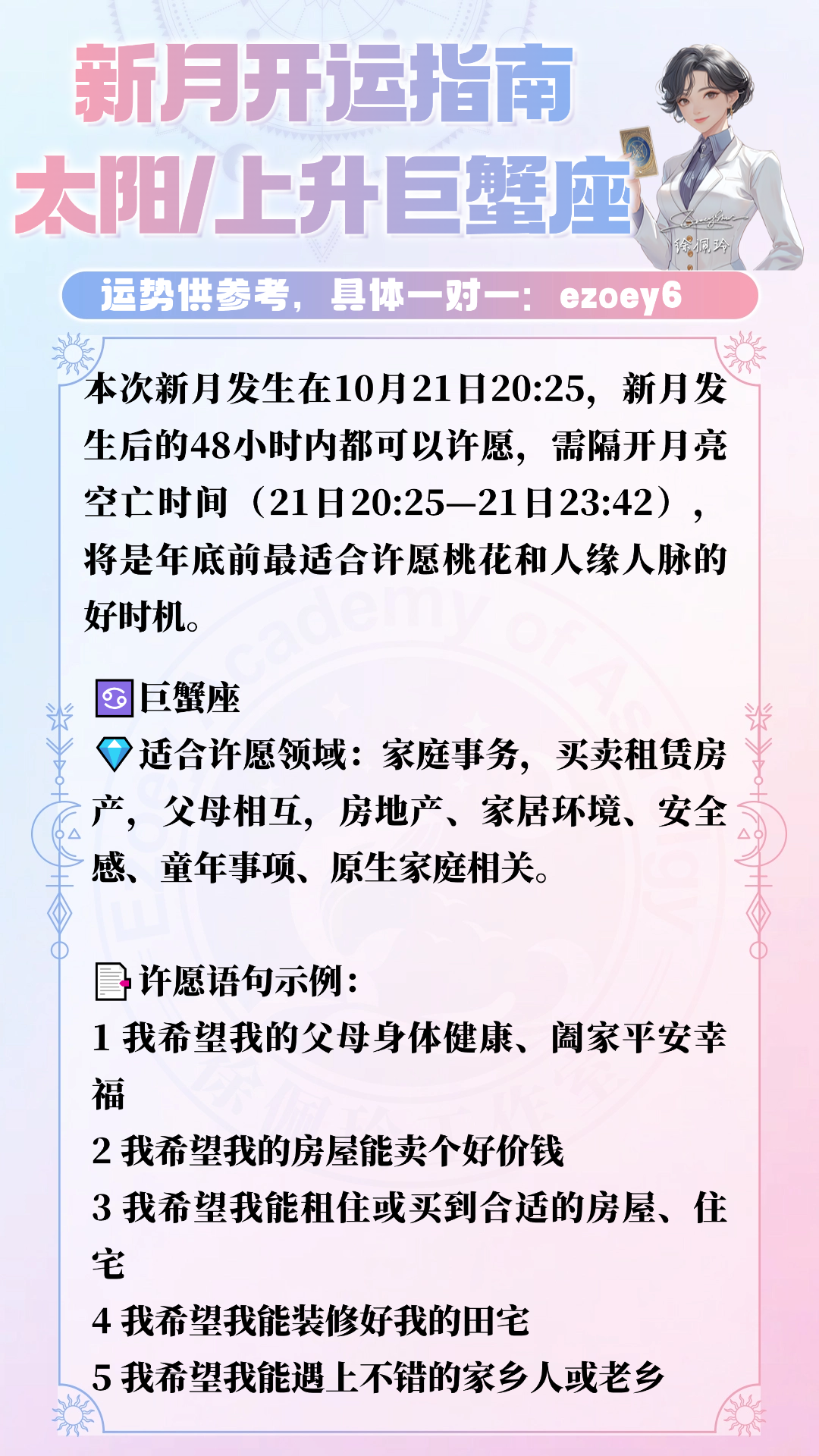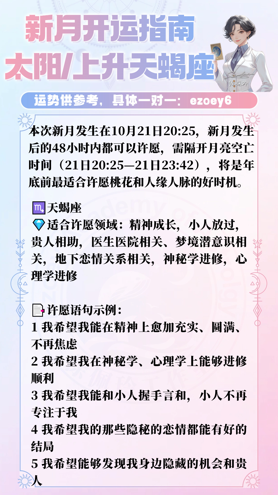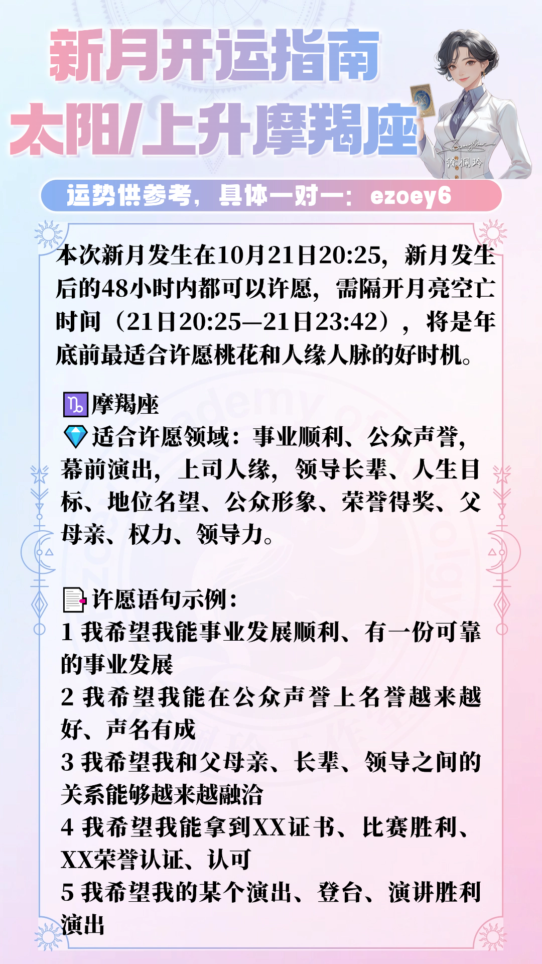 本次新月发生在10月21日20:25,新月发生后的48小时内都可以许愿,需隔开月亮空亡时间(21日20:25-21日23:42),将是年底前最适合许愿桃花和人缘人脉的好时机。