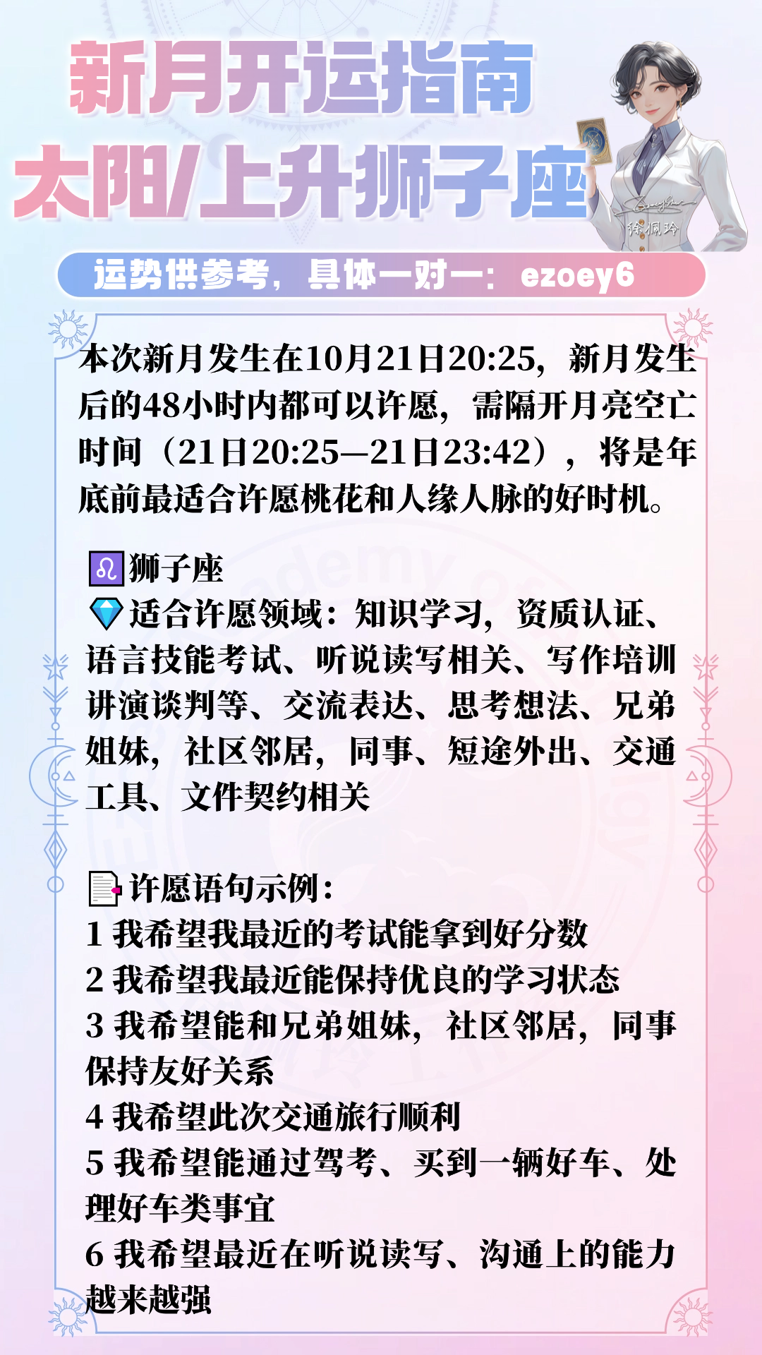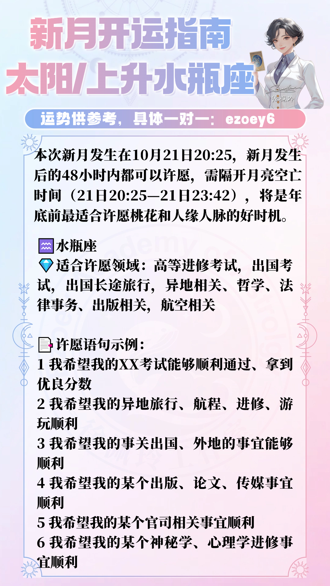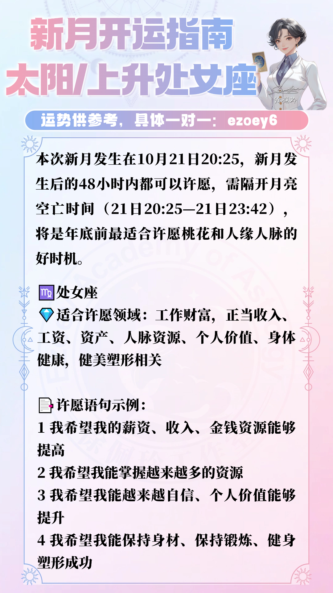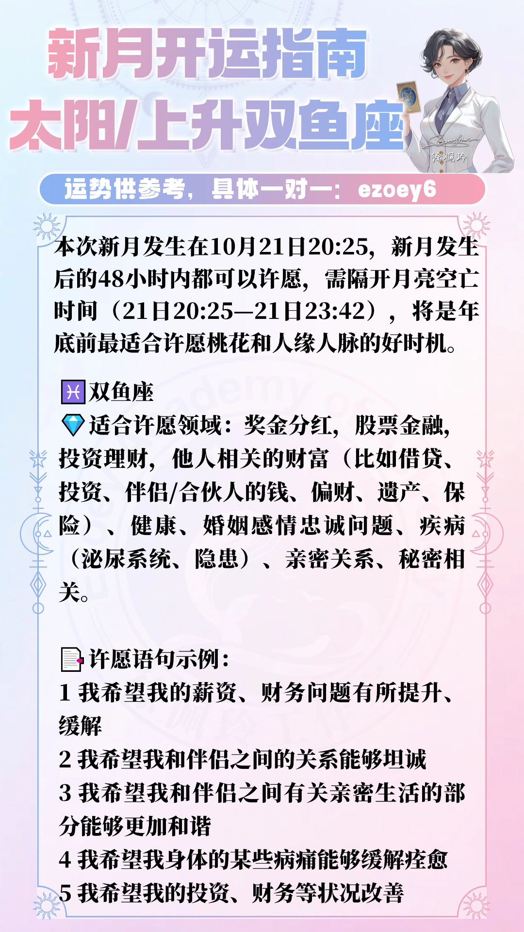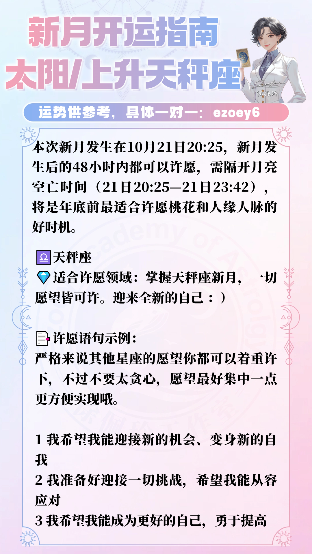 本次新月发生在10月21日20:25,新月发生后的48小时内都可以许愿,需隔开月亮空亡时间(21日20:25-21日23:42),将是年底前最适合许愿桃花和人缘人脉的好时机。