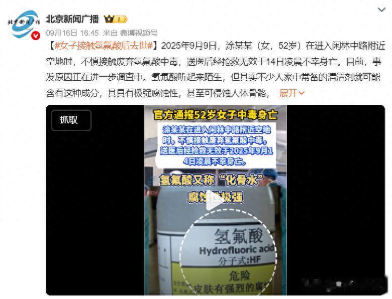 浙江杭州的一女子陪同朋友在户外垦荒种菜时,不小心踩到一个废弃化学品容器,当时就出现剧烈疼痛,虽然随行同伴做了紧急处理,用水清洗后,紧急送医,但到医院才知道,女子踩到的是剧毒物质氢氟酸,最终医治无效不幸离世。