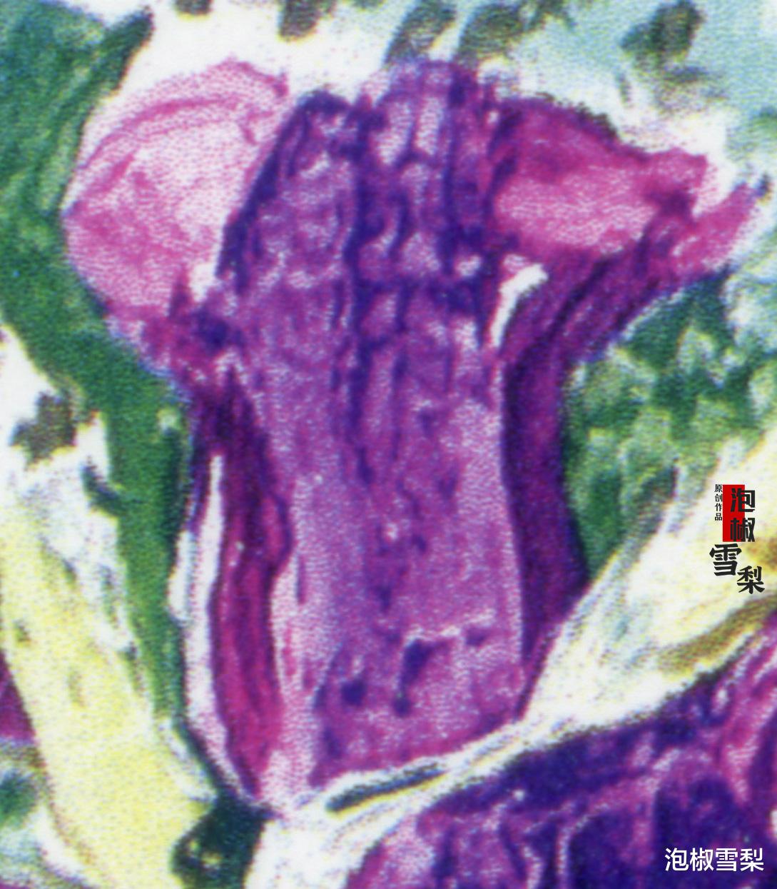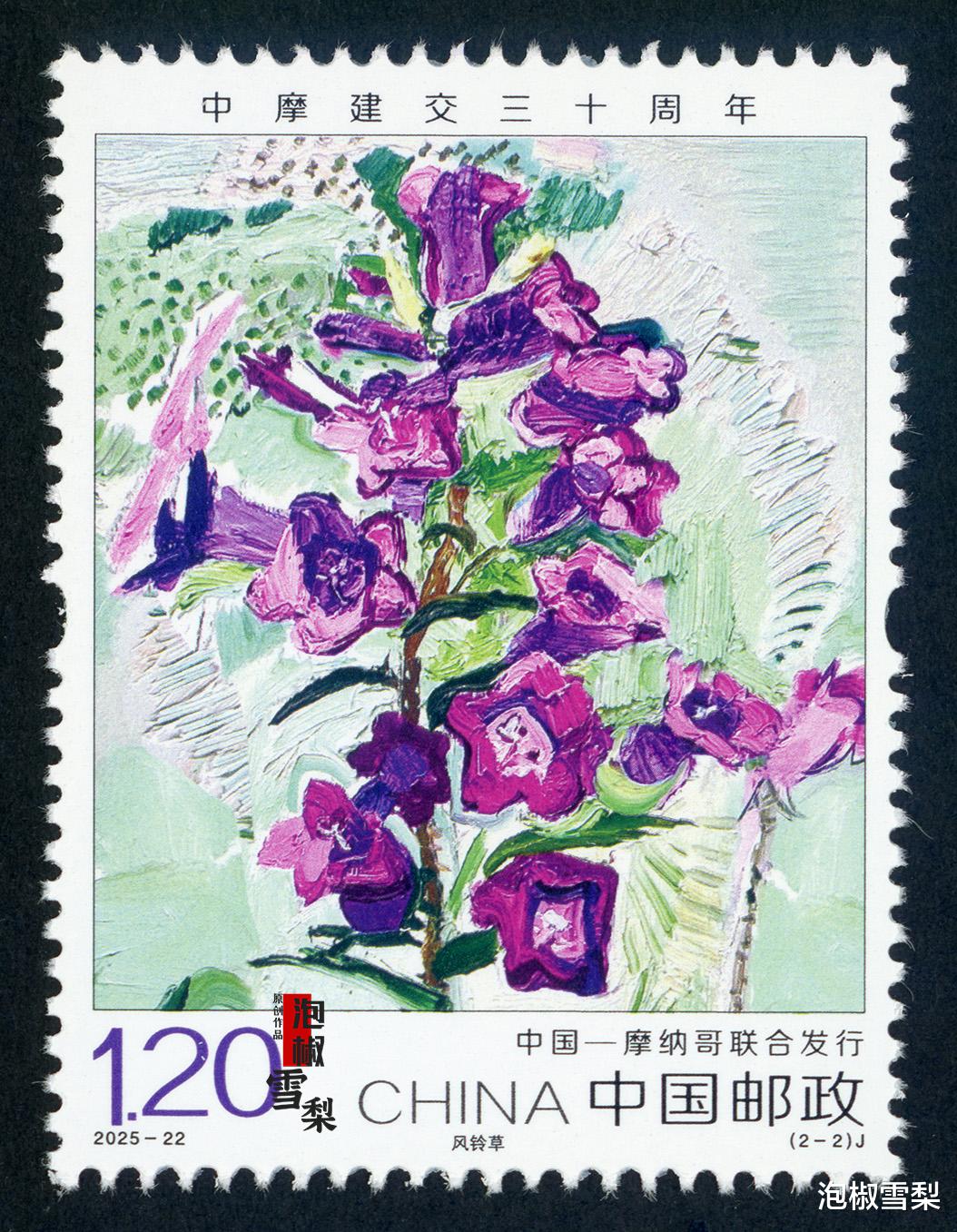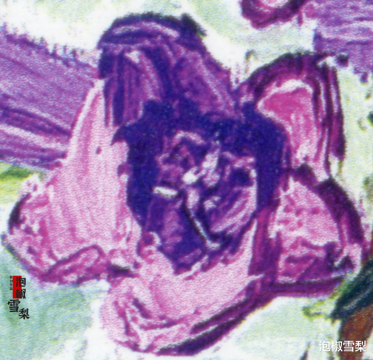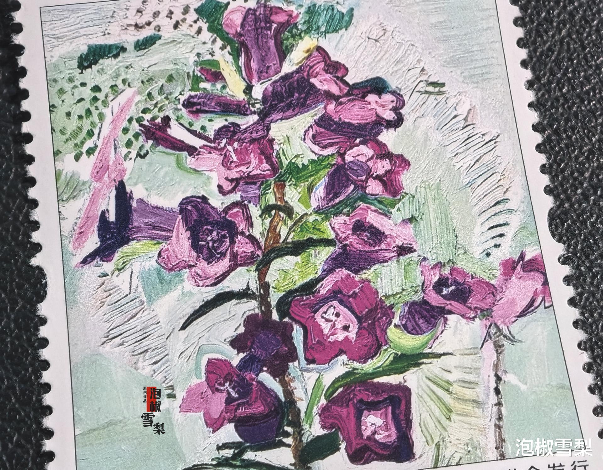 邮票主图采用的是油画作品,直接欣赏时可以清晰的看到绘画特征,春兰清新淡雅,风铃草略显凌乱,颜色上很好的还原了油画本身,艳丽之中带着一丝沉稳,只是整体印刷质量不算太高。
