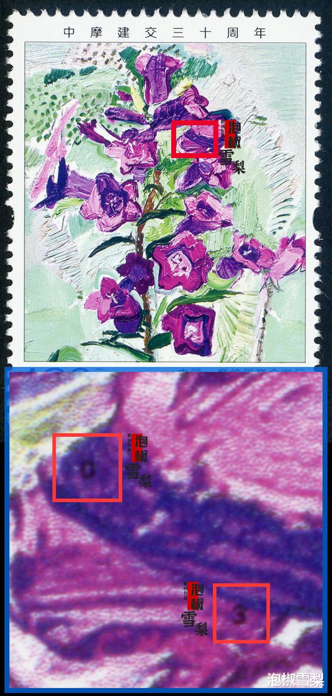 此次邮票采用缩微数字“3”“0”作为暗记,为票名中三十的阿拉伯数字。