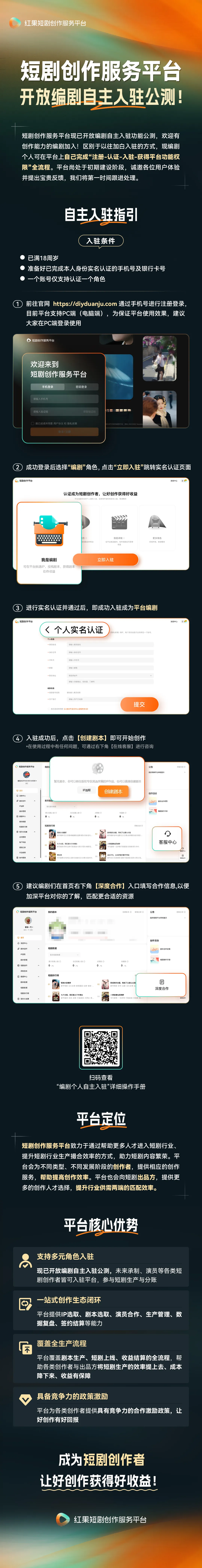 11月3日,红果短剧创作服务平台宣布开放编剧自主入驻公测。编剧个人可在平台上自己完成“注册-认证-入驻-获得平台功能权限”全流程。