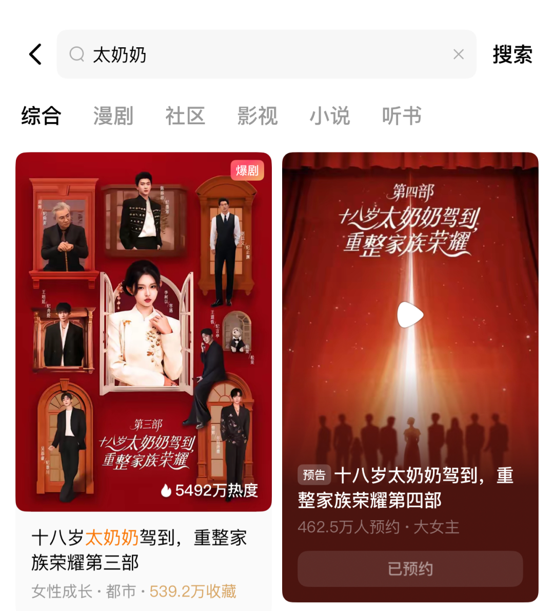 与此同时,《太奶奶4》也已在红果站内开通预约渠道。截至发稿前,预约人数为462.5万。