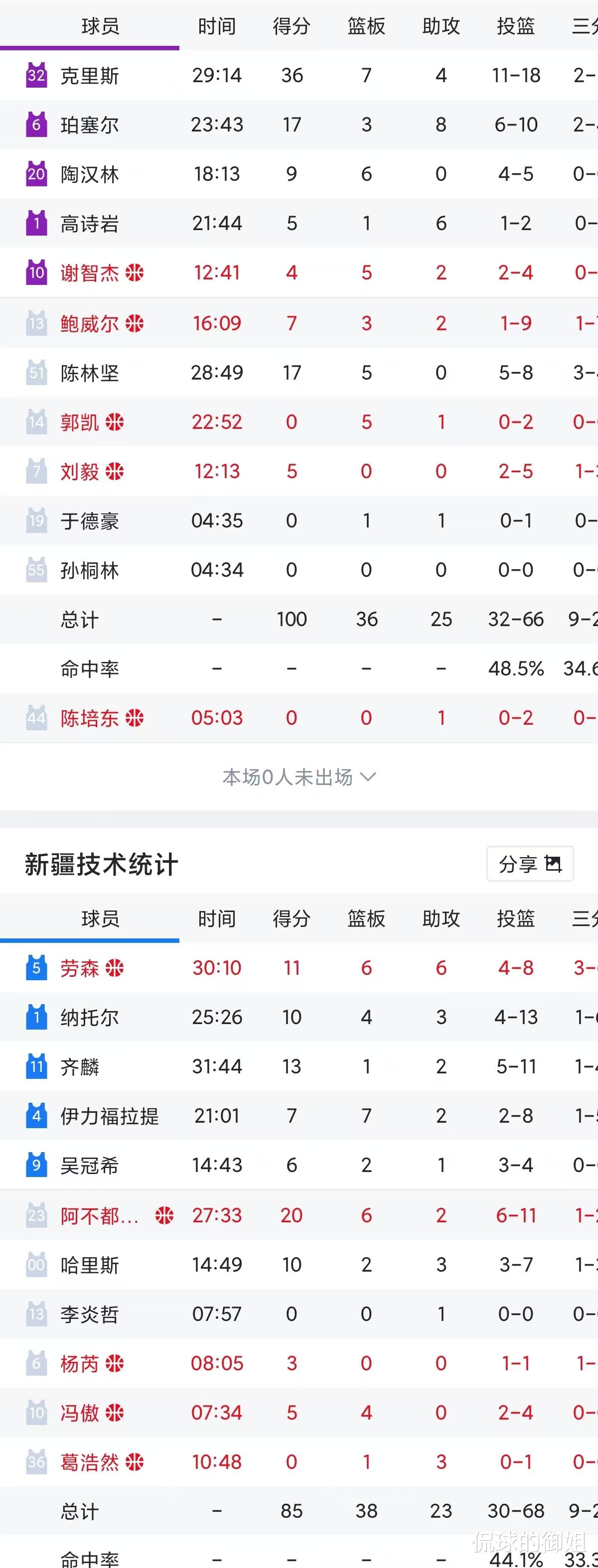 末节比赛,纳托尔三分先进,克里斯两罚全中,伊利福拉提三分再进,陈林坚回敬两分,陶汉林进攻犯规5犯离场,李炎哲随后也被吹违体犯规,山东队确实牢牢掌控节奏,新疆队始终无法打出反击势头,山东节末直接换上全华班登场,最终山东100-85大胜新疆队。
