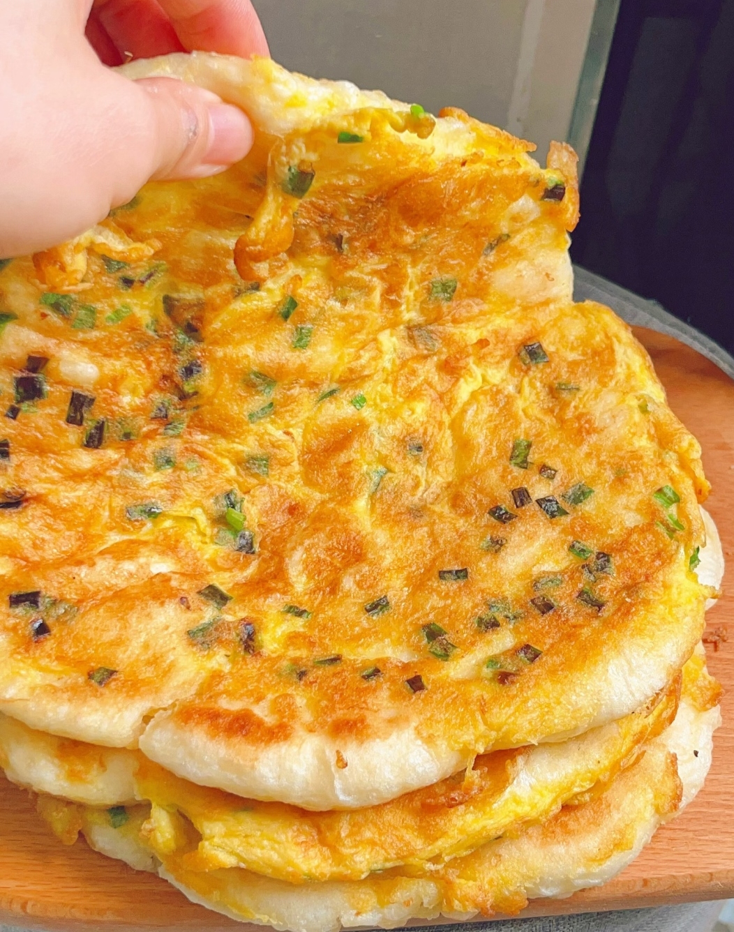 - 培根芝士蛋饼:鸡蛋液里加培根碎和芝士丁,煎熟后拉丝效果绝了!