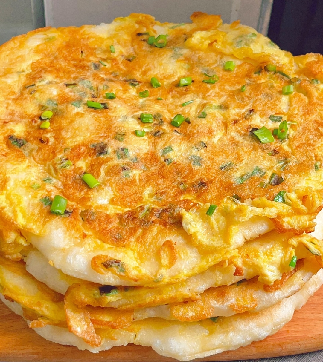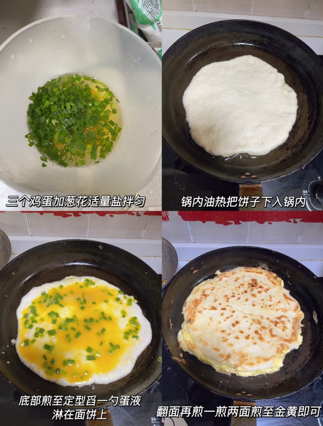 舀一勺葱花蛋液,均匀铺在饼上,稍微晃动锅子让蛋液流均匀。等蛋液边缘开始凝固,果断翻面!另一面也煎到金黄,大概1-2分钟,搞定!