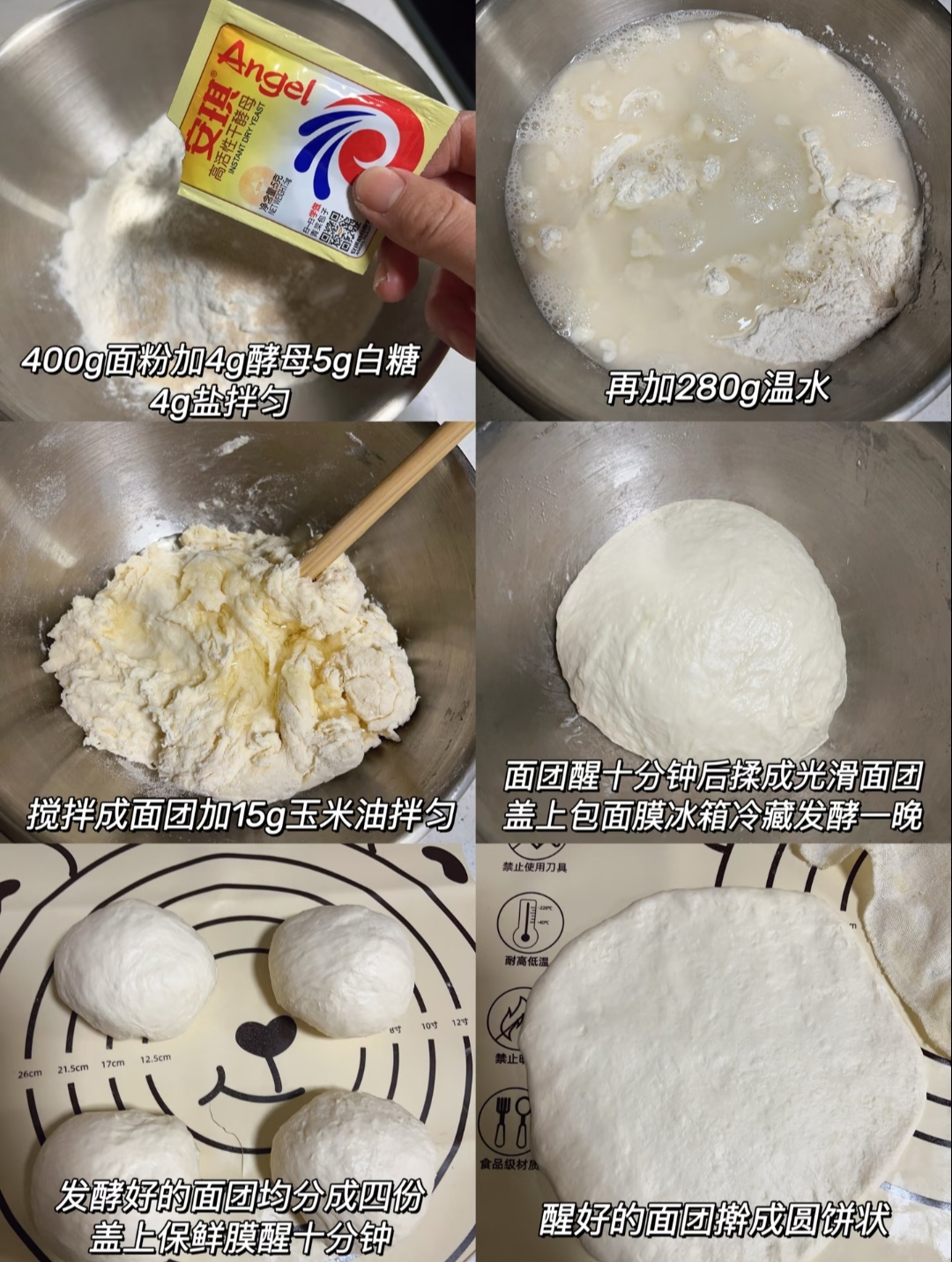 - 早上时间紧?:面团可以冷藏发酵12小时,晚上9点和面,早上8点煎完全没问题。