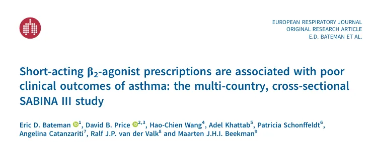 [1] Bateman ED, Price DB, Wang HC,et al. Short-acting β2-agonist prescriptions are associated with poor clinical outcomes of asthma: the multi-country, cross-sectional SABINA III study[J]. Eur Respir J. 2022 May 5;59(5):2101402. Doi: 10.1183/13993003.01402-2021.