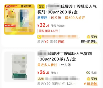 现如今,在主流电商平台上搜索“沙丁胺醇”,大量药店在售。即便它是处方药,用户也只需简单勾选“已确诊疾病”,几秒内就能完成线上开方,几十元就能买到一支。很多患者“没有摸到规范诊疗的大门”,网络购药让自行购买SABA变得极其便利,导致近半自购者已达过度使用标准。