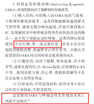 ● 2026年,《中国支气管哮喘基层诊疗与管理指南(2026年)》在治疗药物中不再提SABA,在介绍这种药物时,指出不宜长期、单一、过度应用,并明确提示其风险。