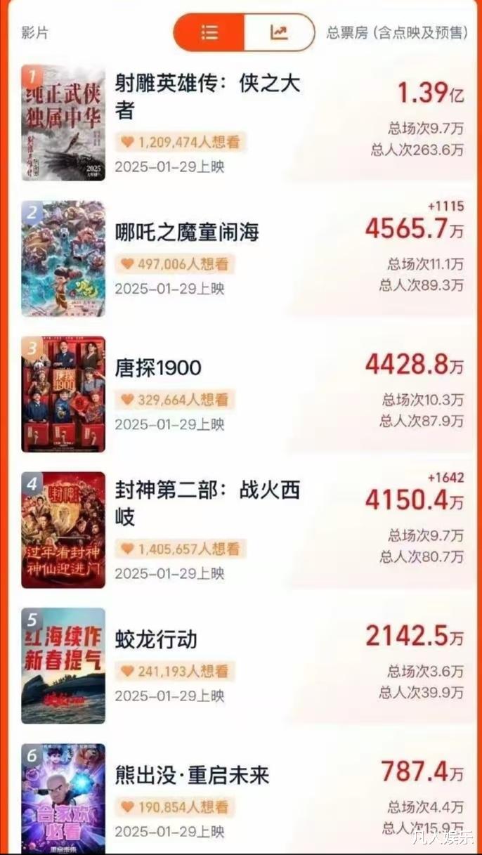 由于整个预售期,票房排名基本没有变化,导致很多人以为春节档票房冠军非《射雕英雄传:侠之大者》莫属,结果没想到影片正式上映首日票房排名来了个大洗牌。