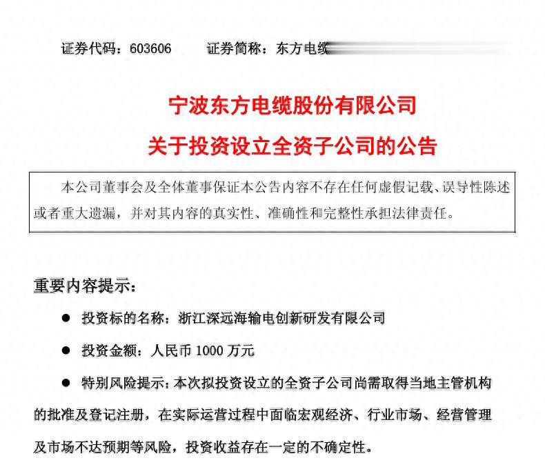 2025年12月20日,国内海缆行业龙头企业东方电缆正式发布《关于投资设立全资子公司的公告》,宣布以1000万元自有资金在舟山嵊泗设立全资研发子公司。