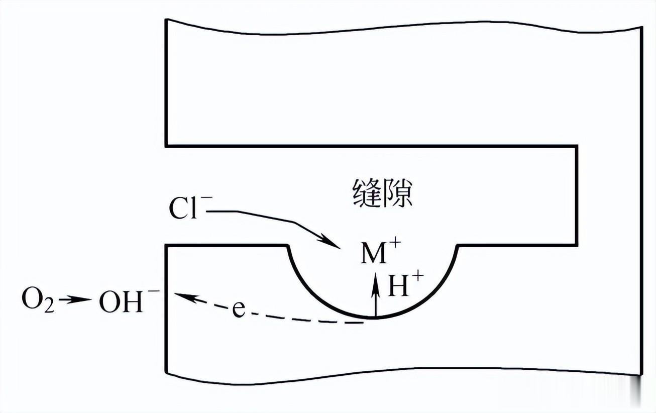 缝隙腐蚀的机理,一般认为是浓差腐蚀电池的原理,即由于缝隙内和周围溶液之间氧浓度或金属离子浓度存在差异造成的。缝隙腐蚀在许多介质中发生,但以含氯化物的溶液中最严重,其机理不仅是氧浓差电池的作用,还有像点蚀那样的自催化作用,如图3所示。