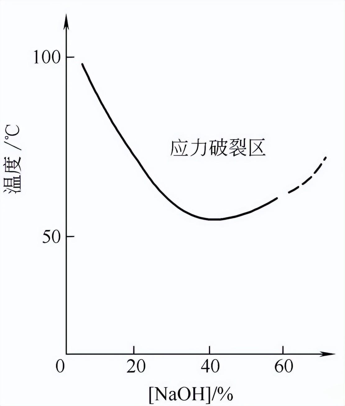 图6 产生应力腐蚀破裂的烧碱浓度与温度关系