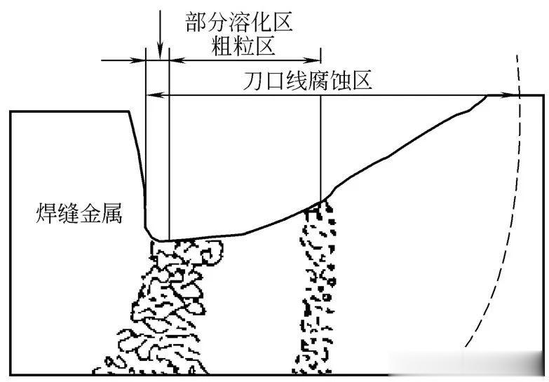 ③ 熔合线处的刀口腐蚀,一般发生在用Nb及Ti稳定的不锈钢(347及321)。刀口腐蚀大多发生在氧化性介质中。刀口腐蚀示意如图4所示。