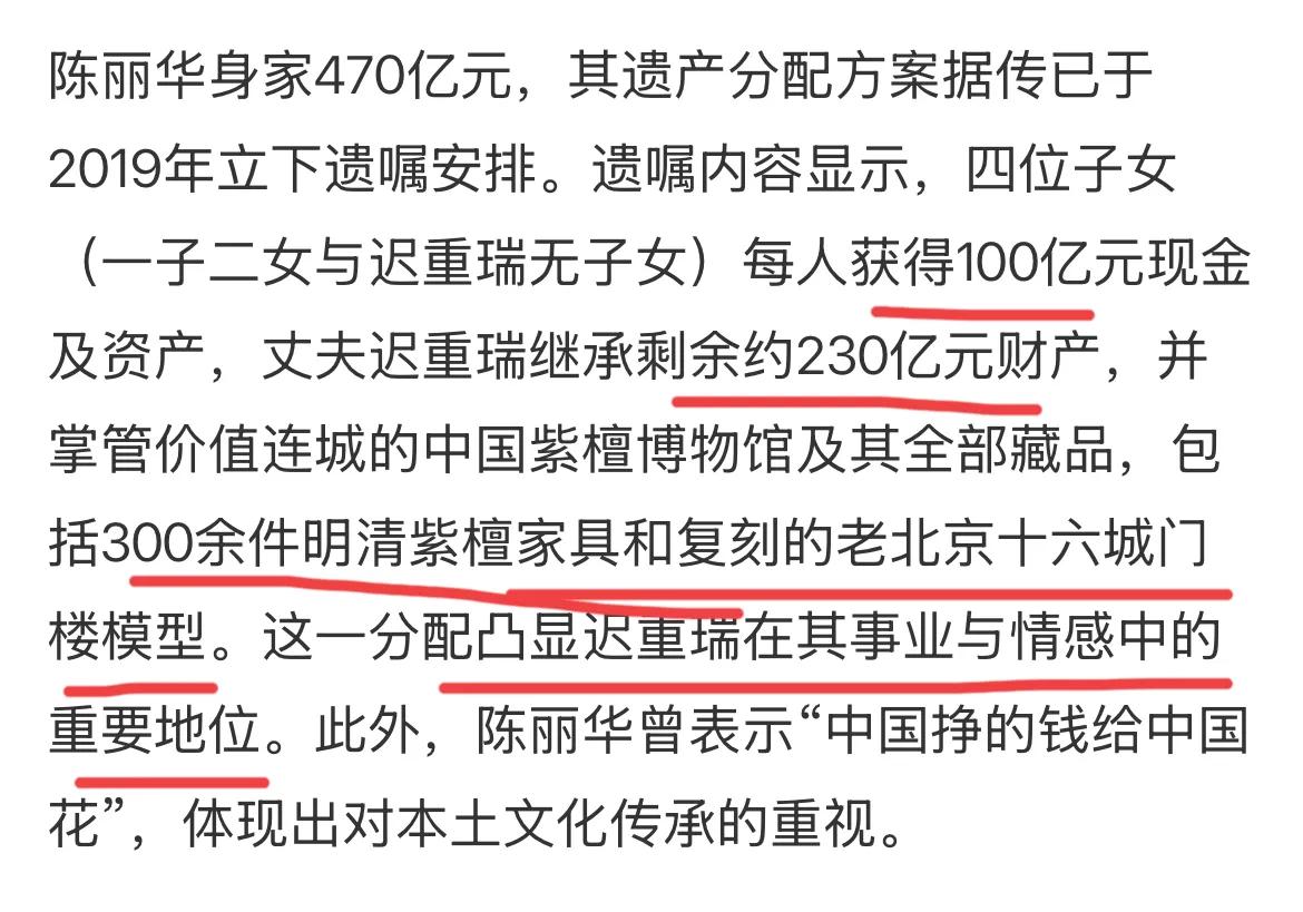 其实早在2019年,陈丽华就已经立了遗嘱,子女各分100亿现金及资产,剩余则交由迟重瑞继承。