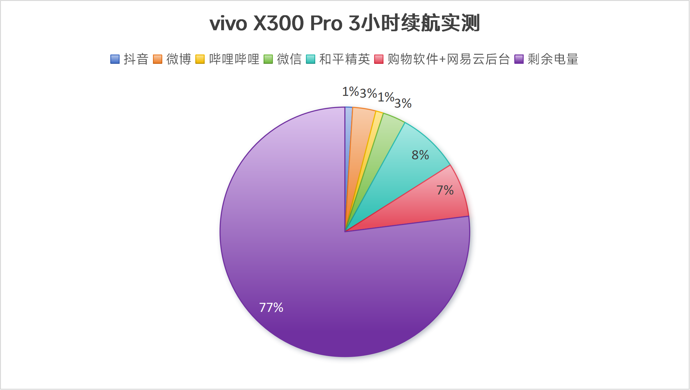 经过实测,vivo X300 Pro在使用多款软件综合时长达3小时后,其剩余电量为77%,续航表现属于今年旗舰机里的主流水平。