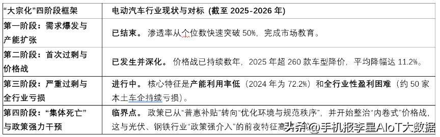 总的来看,根据我之前建立的“大宗化”周期分析框架,结合最新的行业数据来看,电动汽车行业已明确进入第三阶段,即“严重过剩与价格战”阶段,正处在行业剧烈洗牌的前夜,并向“集体死亡/政策干预”的第四阶段演进。