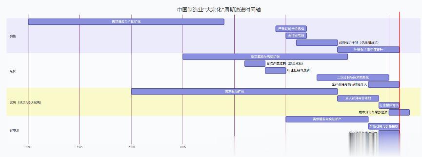 从哪一年出现大宗化?行业首次出现全行业性亏损或主要产品价格较周期性高点下跌超过50% 的年份,通常就是“大宗化”的明确标志年。例如:钢铁是2015年,光伏是2023年,锂电池是2023年。