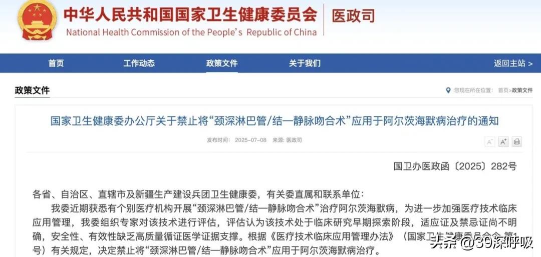 2025年7月8日,国家卫健委发布通知,正式叫停颈深淋巴管/结—静脉吻合术用于阿尔茨海默病的治疗。通知指出,综合评估认为,这项技术应用于阿尔茨海默病治疗尚缺乏相关临床前研究的直接证据,该技术处于临床研究早期探索阶段,适应证及禁忌证尚不明确,其安全性、有效性和经济性缺乏高质量循证医学证据和卫生经济学证据。