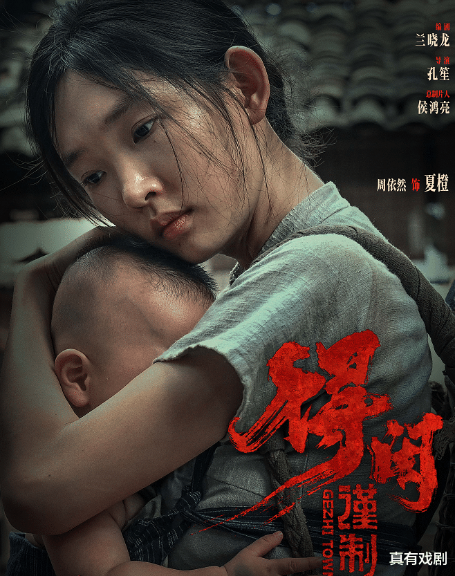 海报里,莫得闲带着妻子、老太爷和孩子严阵以待,夏橙紧抱怀中婴儿,老太爷手持简陋武器,孩子天真的笑容和战争的残酷形成强烈反差。