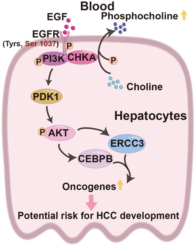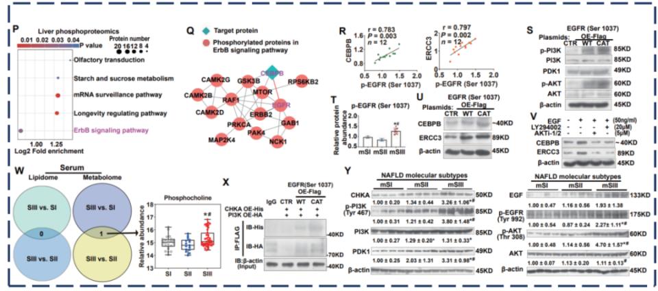 总之,初步机制探索显示,在MASLD-mSIII发病过程中,高水平的EGF通过p-EGFR,一方面激活PI3K-PDK1-AKT信号通路,进而促进CEBPB和ERCC3调控的癌基因表达;另一方面提高血清磷酸胆碱水平,最终增加HCC风险。