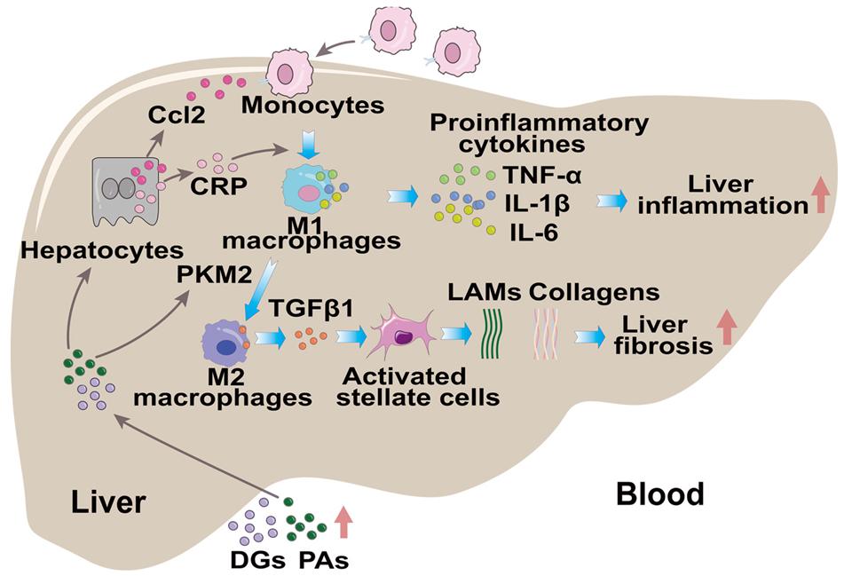 总之,初步机制探索表明,在MASLD-mSII发病过程中,肝脏内过高的血脂刺激CCL2和CRP分泌,引起单核细胞募集和M1型巨噬细胞极化,从而导致肝脏炎症。此外,脂质诱导PKM2高表达,促进M1向M2型巨噬细胞转化,并通过增加TGFβ1生成和HSC活化加重肝纤维化。