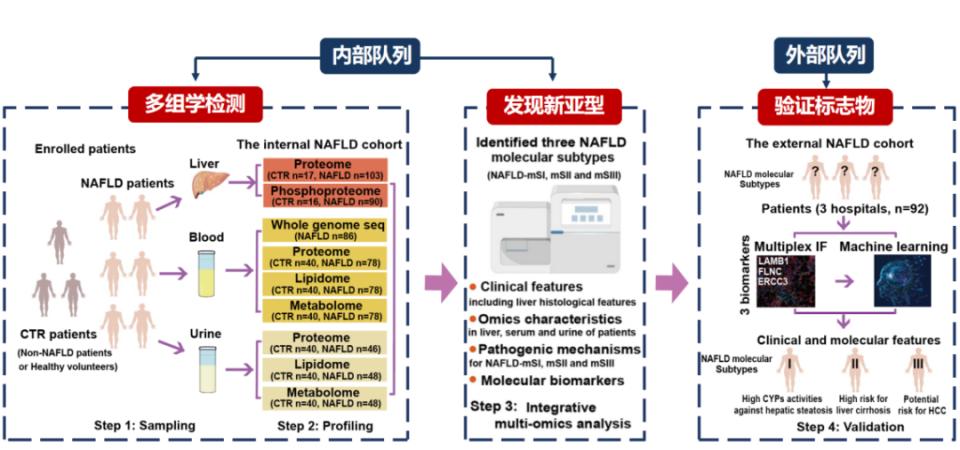 实验设计与分析流程为解决MASLD异质性这一领域瓶颈,研究团队联合国内多家中心,收集了肝穿刺样本、血液和尿液标本,开展了肝脏蛋白质组学、磷酸化组学、代谢组学及基因组学等多组学检测,旨在通过多维度数据整合发现新的临床亚型。团队利用机器学习等方法对数据进行聚类分析与特征筛选,并在内部队列中发现分型后,进一步在独立外部队列中进行验证,以确证分型的稳定性和普适性。