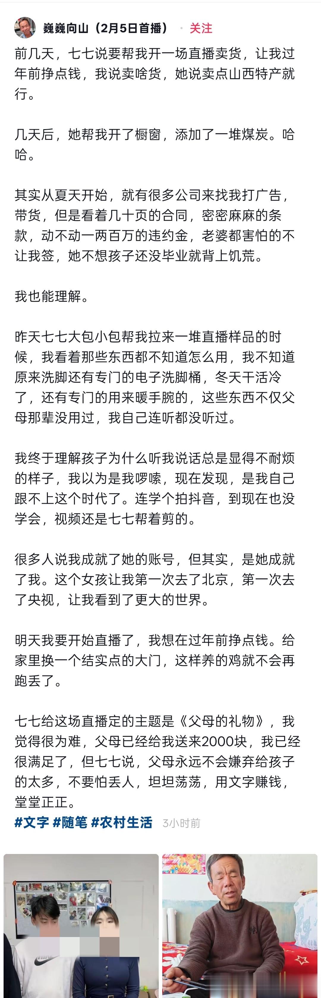 “七七给这场直播定的主题是《父母的礼物》,我觉得很为难,父母已经给我送来2000块,我已经很满足了,但七七说,父母永远不会嫌弃给孩子的太多,不要怕丢人,坦坦荡荡,用文字赚钱,堂堂正正。”