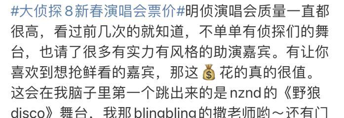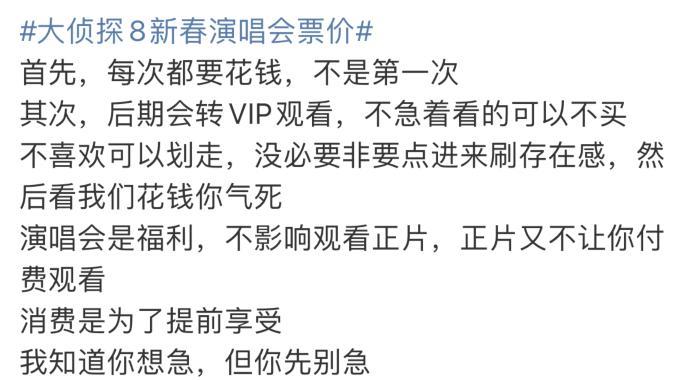 按照道理来说,《明侦8》终于要开播了,应该是件大喜事,但在节目官宣演唱会阵容后,一则名为“大侦探8新春演唱会票价”的词条却被推上了热搜,付费观看模式引起了争议。甚至有人喊话节目组穷疯了,还未开始正片就捞钱了,吃相过于难看。