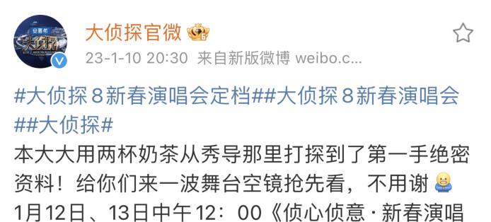 所谓“新年新气象”,随着2023年正式到来,超多电视剧以及综艺节目启动拍摄,继《五哈2》因为鹿晗频繁被推上热搜后,由芒果台独家打造的推理类真人秀《明星大侦探》第八季也于10日晚率先官宣定档,节目组正式宣布首次更新时间为12日、13日,连更两天。