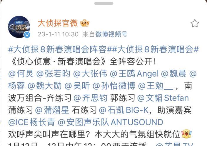继《明侦》官微高调官宣节目播出时间后,又于1月11日连发多条微博为节目上线预热,透露的信息量非常大。与前几季一样,《明侦》正式案件上线前,节目组特地准备了一场高质量演唱会,在让观众大饱眼福的同时,也相当于嘉宾们一年一度的聚会,意义重大。