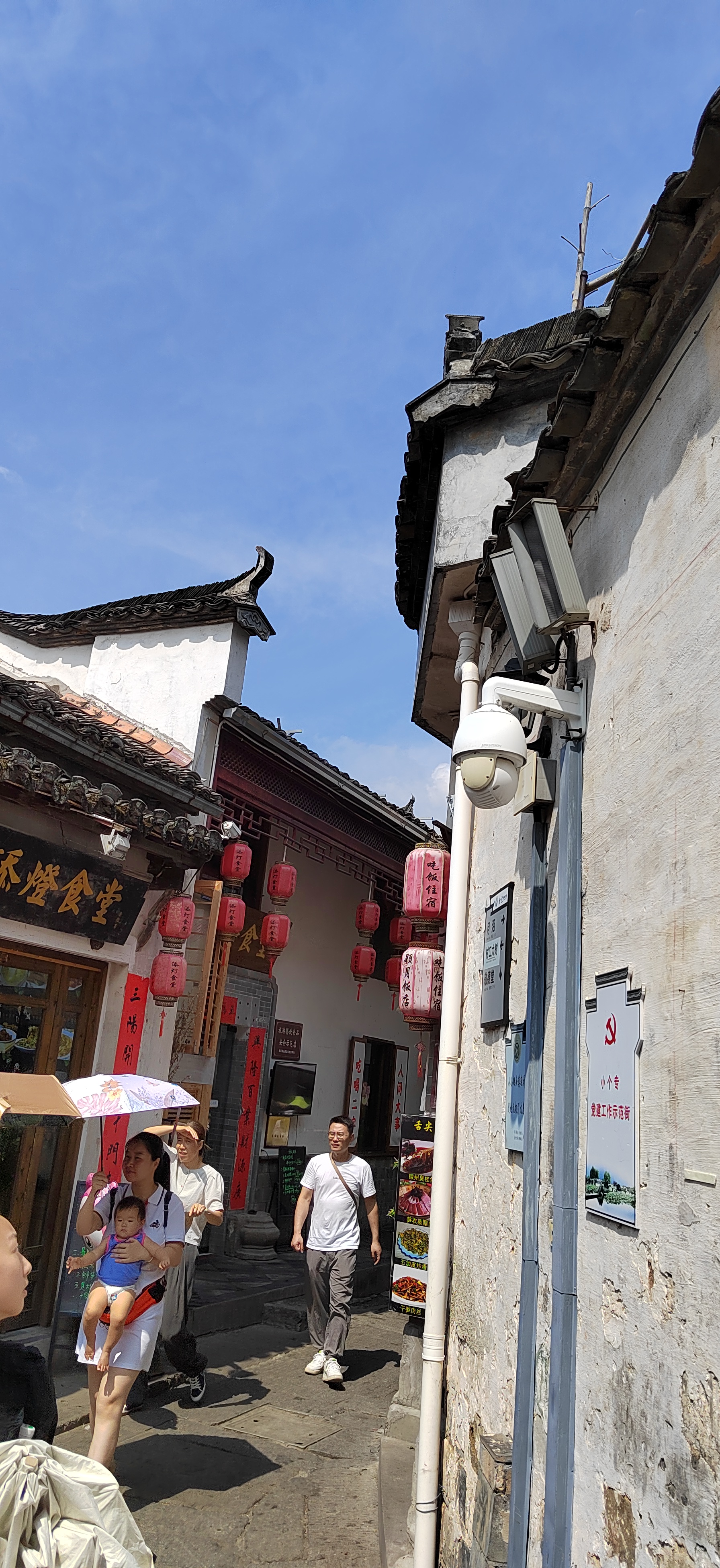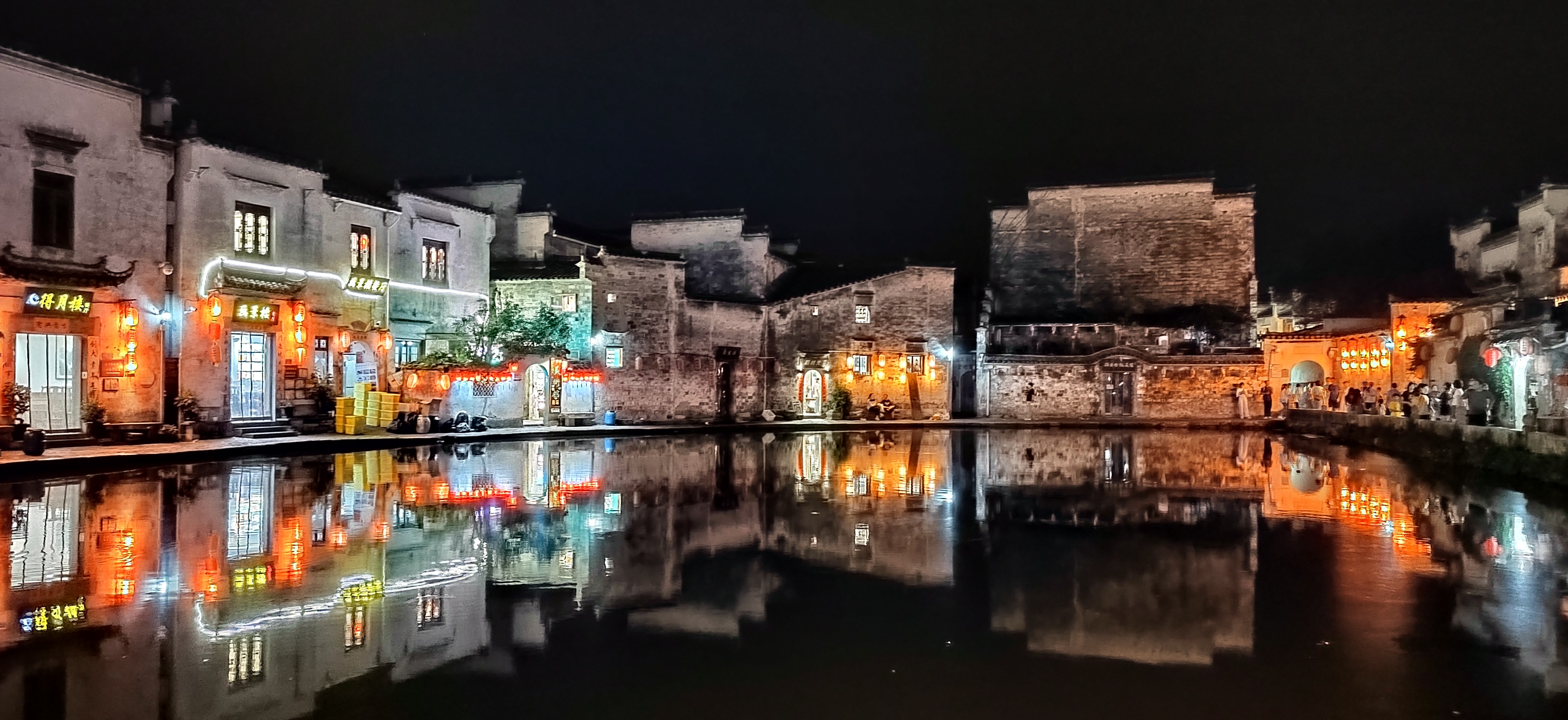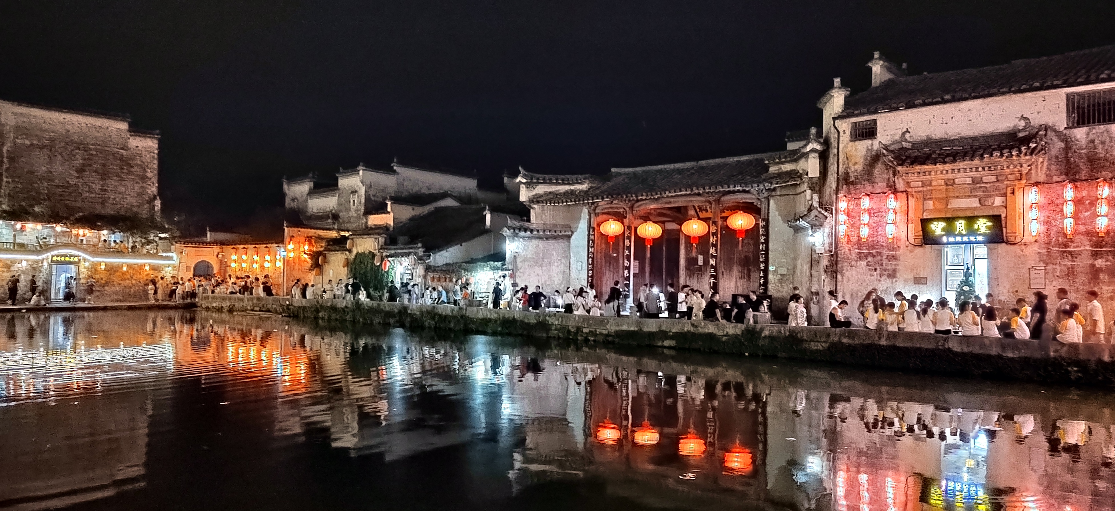 日暮时分,红灯笼次第亮起,映照著爬满蔷薇的马头墙,宏村的夜市也渐渐热闹起来,美食香气为古村添满烟火气。酱鸭腿在灯光下泛着油亮的酱色,肉质紧实耐嚼,咸香入味;现炸的年糕刷上自制酱汁,软糯中带着酱香,是逛累后的绝佳补给。晚风拂过南湖,暑气渐消,游人散去后,古村重拾静谧,唯有水圳依旧流淌,载着千年时光、夏日余温与美食香气,让这场暑日之行,藏满了水墨诗意与舌尖温柔。
