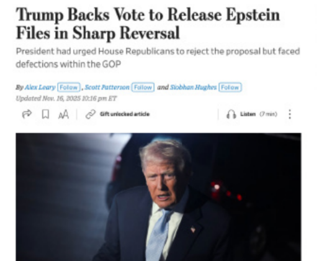 另一名支持公开档案的共和党众议员马西称川普此举是“阻止爱泼斯坦档案公开的垂死挣扎”。