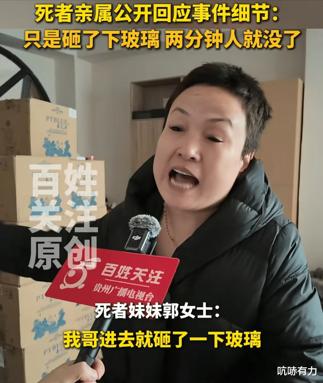 郭某某的妹妹称:“我哥进去就砸了下玻璃,也没有说打人干什么的,一起来就咣一下把玻璃踹到了,两人就扭打在一起了,就前后两分钟人就没了。”