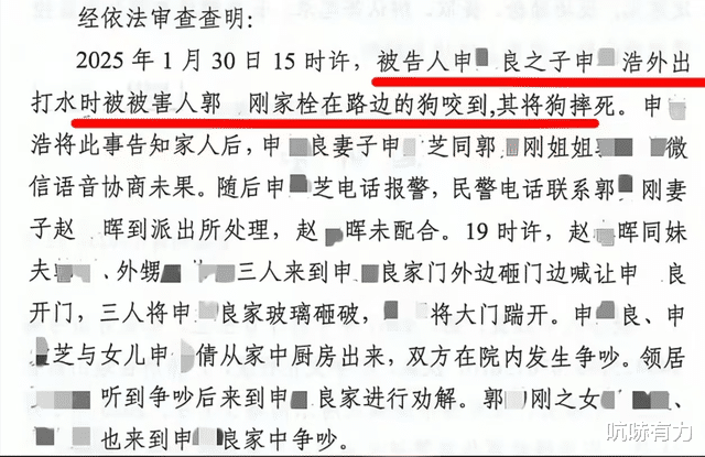据扬子晚报报道,2025年1月30日下午3点左右,申某良的儿子外出打水时被郭某某家拴在路边的狗咬到,随后他将狗摔死。